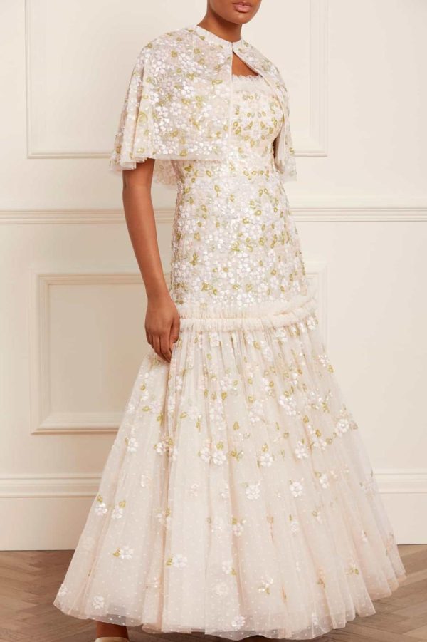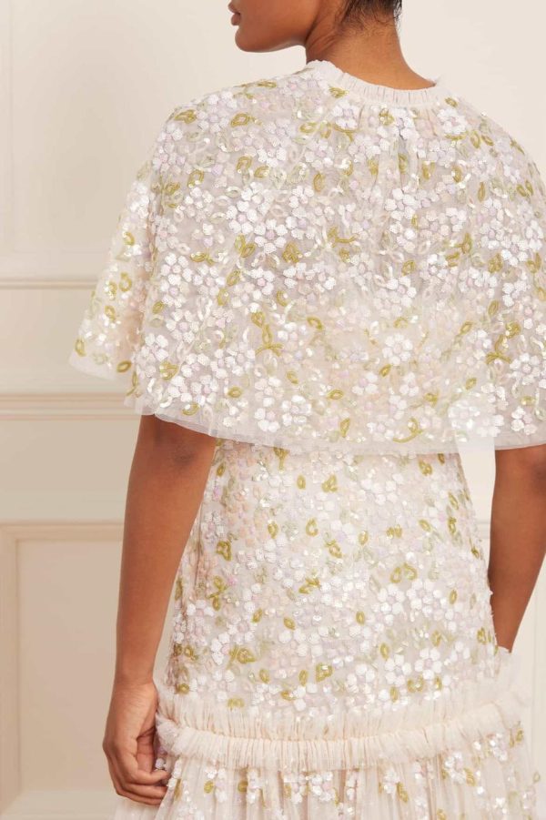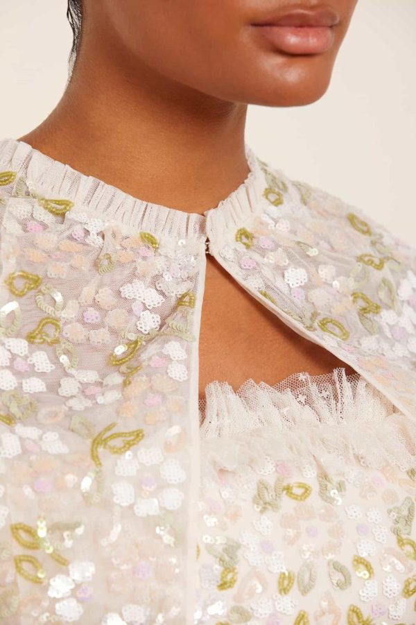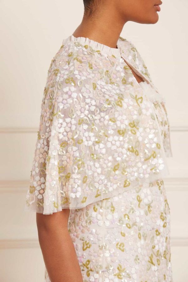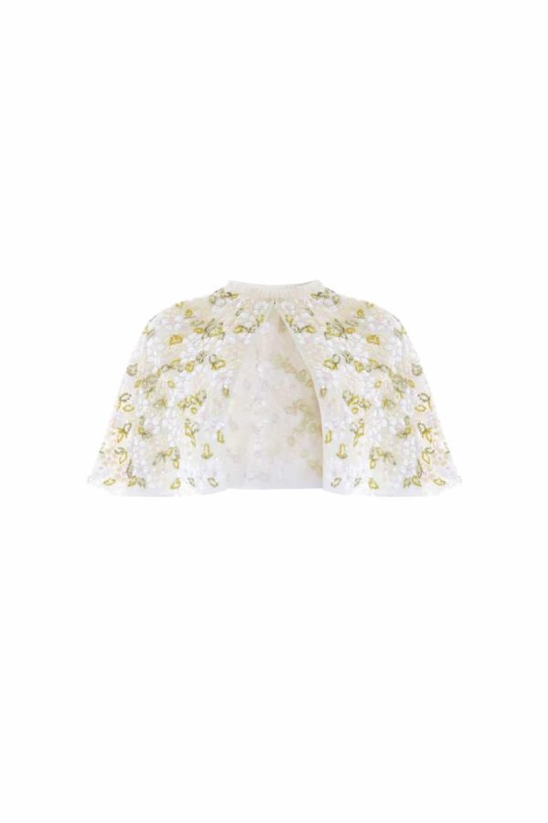 Discover the enchanting Brianna Short Open Cape in Cream/Multi, featuring exquisite floral motifs and dazzling sequins that create a captivating all-over shimmer. Crafted with our signature airy tulle and adorned with elegant frill detailing for a truly romantic aesthetic. Perfectly complement this stunning cape with the