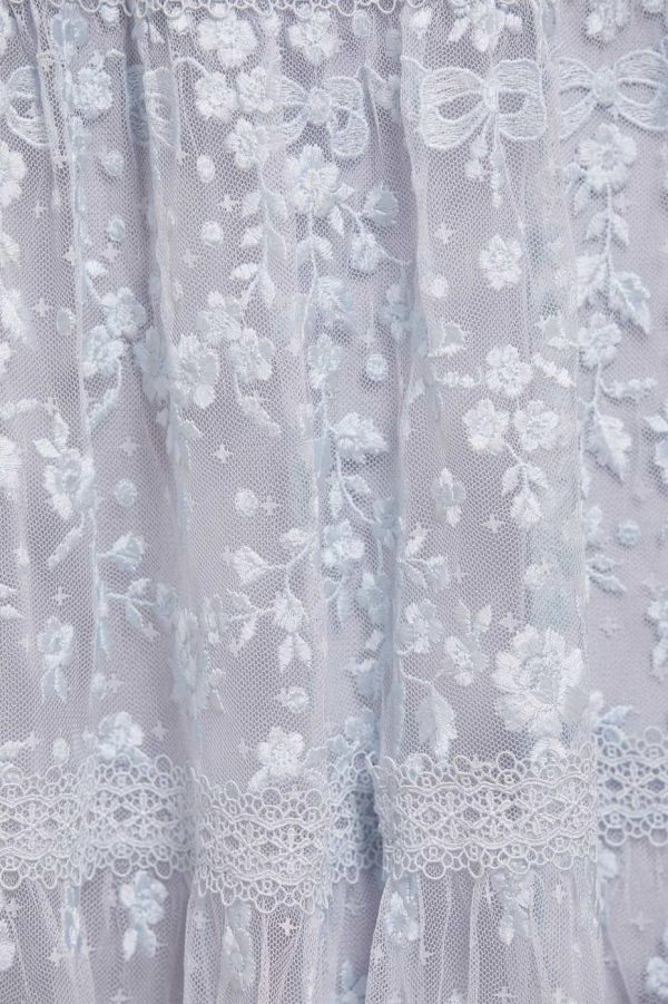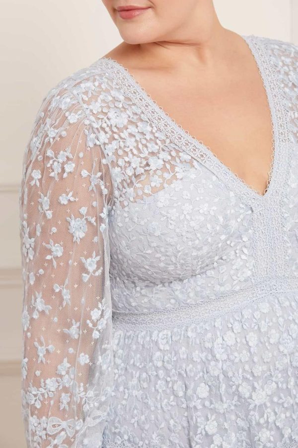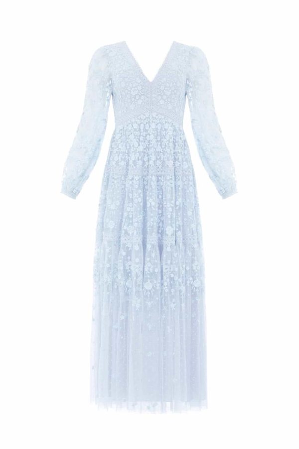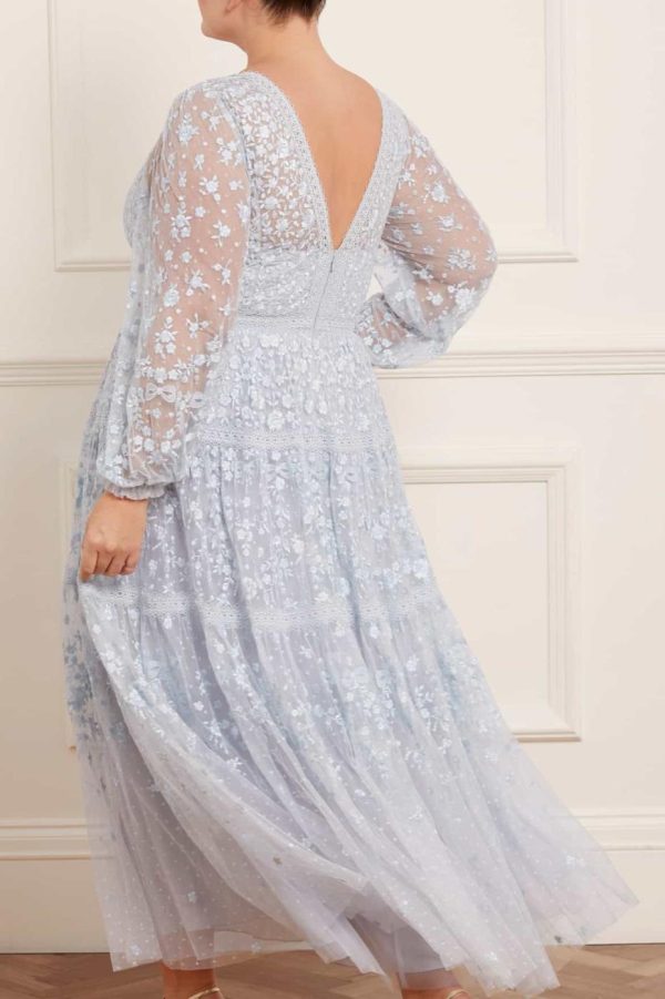 Introducing the stunning Celestia Ribbon Gown in captivating Blue. This exquisite gown showcases intricate embroidery inspired by vintage lace designs, featuring beautiful floral motifs and elegant ribbon accents throughout. Expertly crafted with delicate lace trims that highlight Needle & Thread’s signature attention to detail, and constructed with a premium textured tulle foundation. Features a flattering V-neckline and a beautifully tailored silhouette that enhances your natural shape. Make a unforgettable impression in the remarkable Celestia gown.