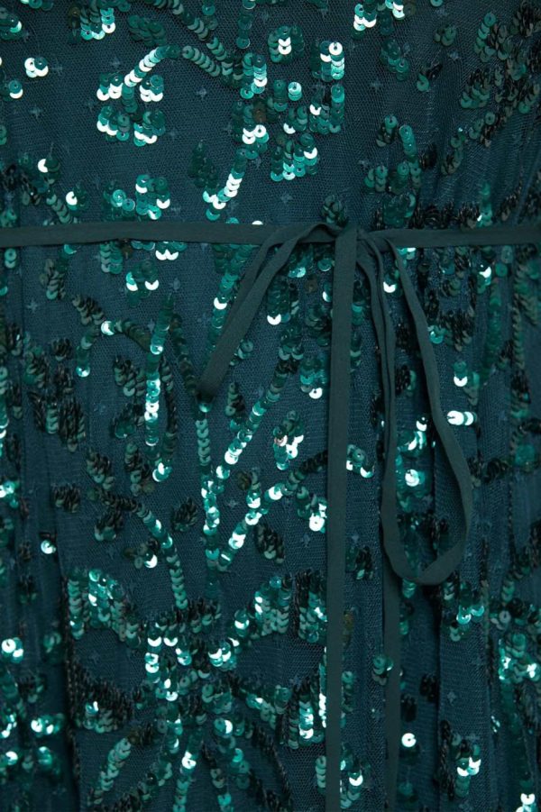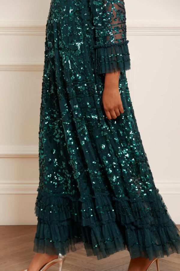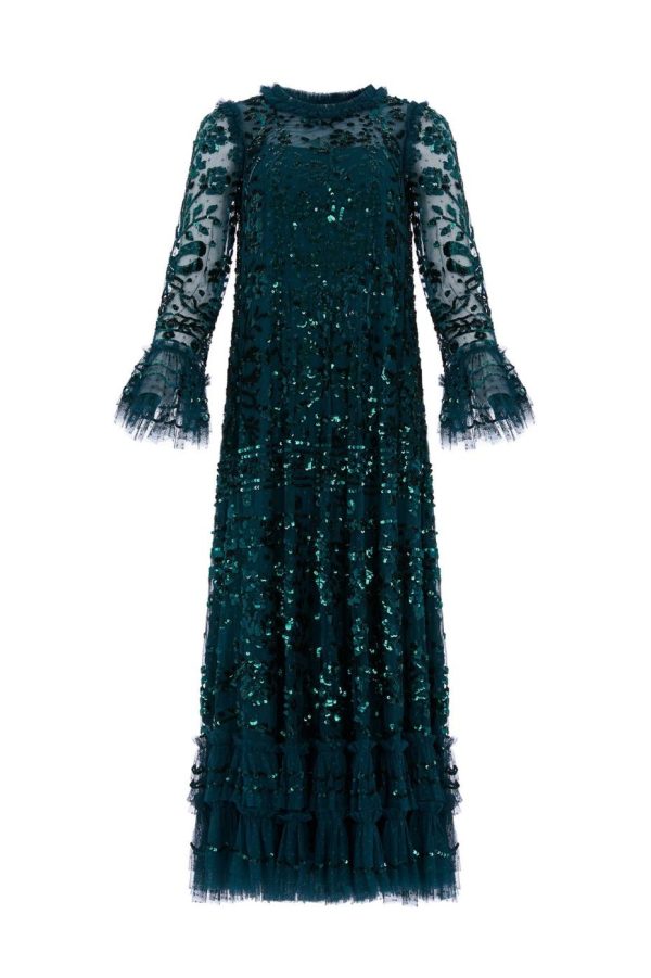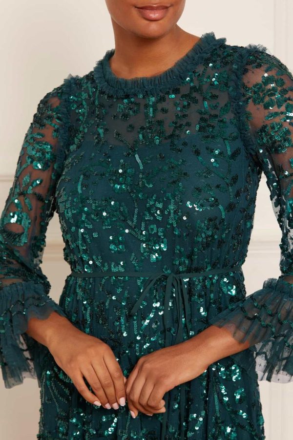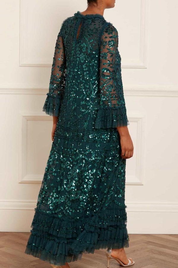 NEW SEASON. The Celia Long Sleeve Ankle Gown in Emerald makes a stunning statement with its romantic floral artwork and elegant ribbon bow details, meticulously adorned with shimmering sequins for breathtaking visual impact. Designed with a graceful loose silhouette featuring delicate tulle frills at the hem and cuffs for added movement and charm. A standout piece in our exclusive collection.
