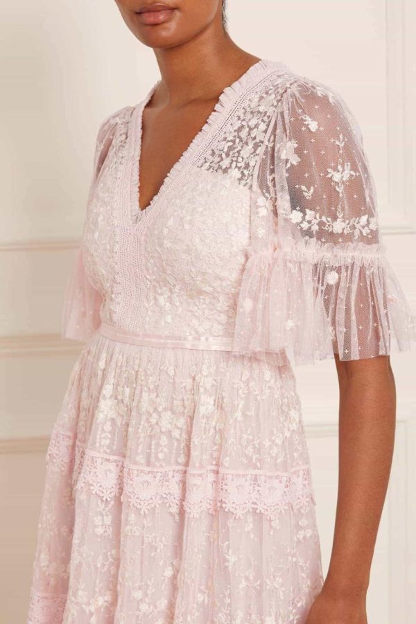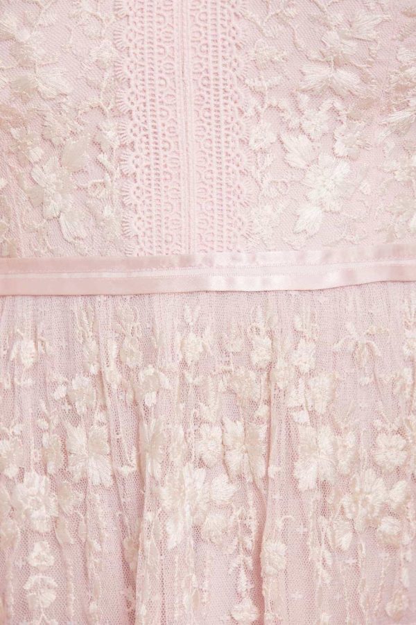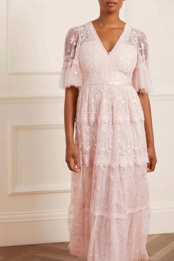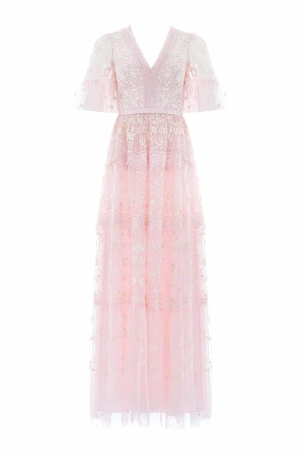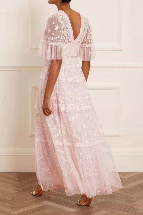 Introducing the stunning Araminta Lace Gown in a beautiful Peony Pink and Cream colorway. This signature Needle & Thread design features exquisite embroidered artwork that creates a truly special occasion look. Elegantly finished with delicate lace trims, a gracefully layered tulle skirt, and a beautifully romantic silhouette that flatters every figure.