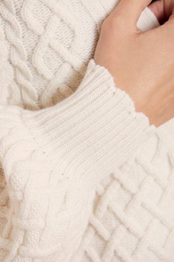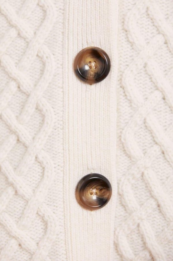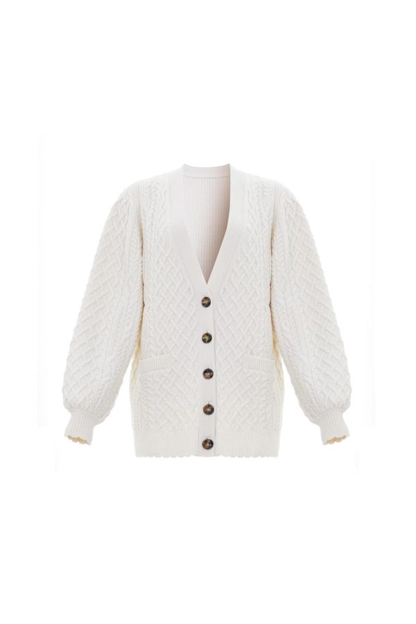 NEEDLE & THREAD EXCLUSIVE. Discover the Elsie Cable Longline Cardigan in Cream, a contemporary piece that beautifully captures vintage knitwear inspiration. This premium cardigan features an incredibly soft wool blend fabric that includes luxurious extra-fine merino wool for exceptional comfort. The intricate diamond stitches combined with twisted cables create a sophisticated textile pattern that elevates any outfit. Designed with an intentionally oversized fit, relaxed pockets, and signature scallop-shaped detailing at the hem and cuffs, this cardigan becomes your perfect go-to layering piece for effortless style.
