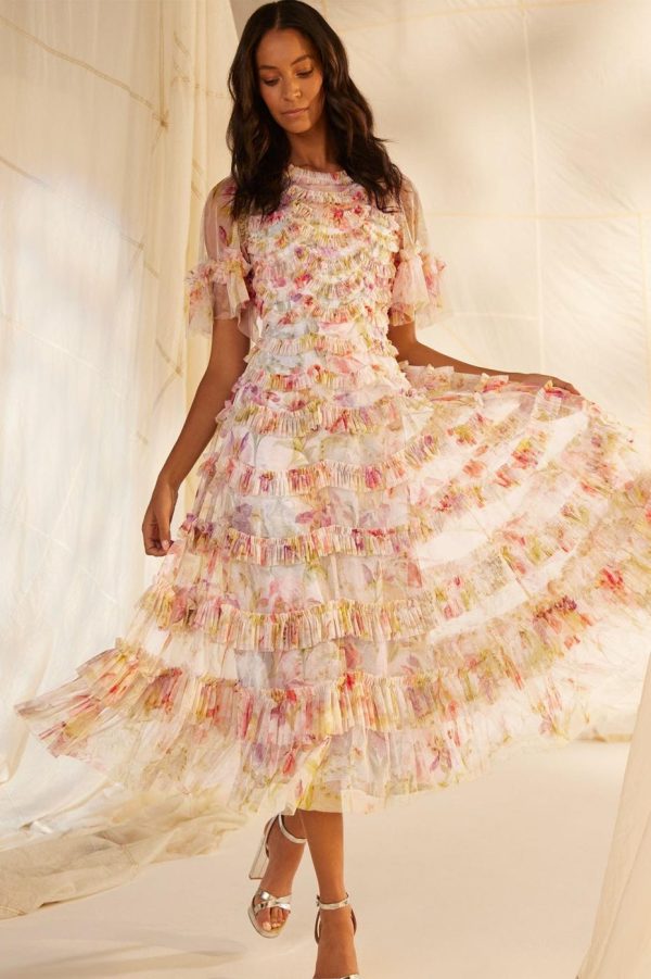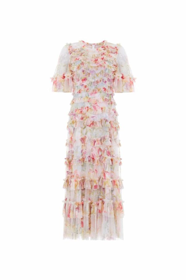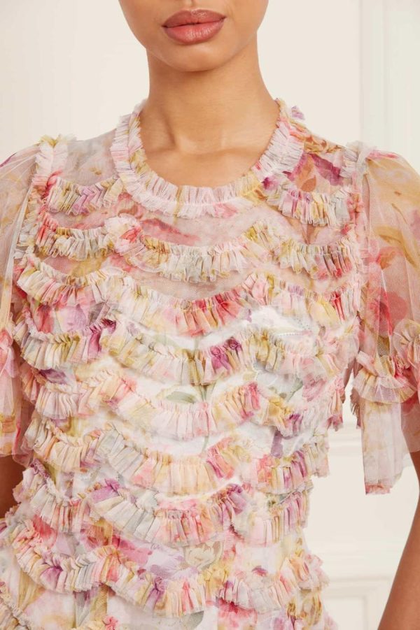 Discover the enchanting Iris Ruffle Ballerina Dress in Moonshine, featuring a stunning floral print with colorful iris blossoms and delicate daisy motifs inspired by authentic 1900s hand-painted designs. Expertly crafted with beautiful tulle scallop detailing that creates elegant textured frills throughout. This standout style features gracefully floaty sleeves and a universally flattering silhouette that delivers a romantic, feminine look perfect for any special occasion.