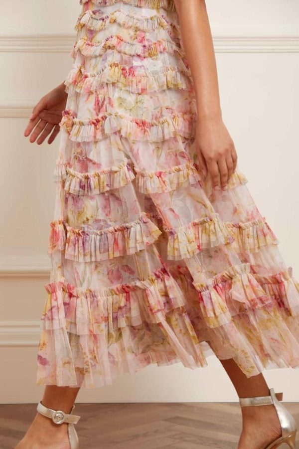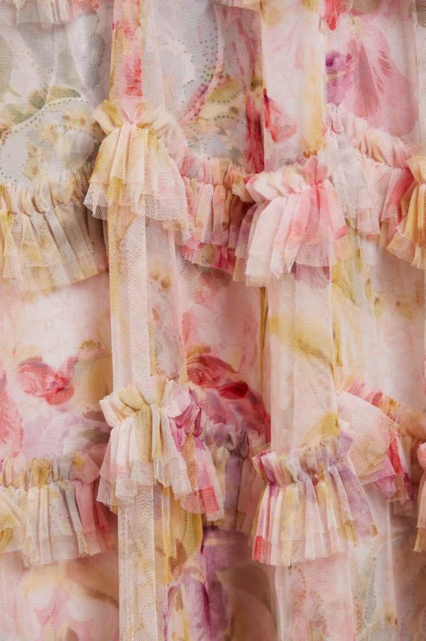 -Floral printed tulle with tulle ruffles