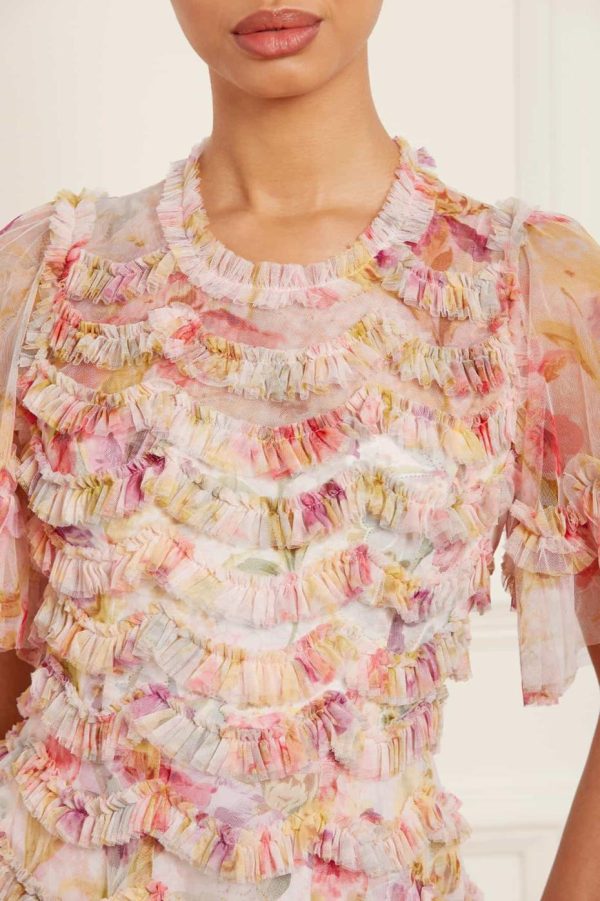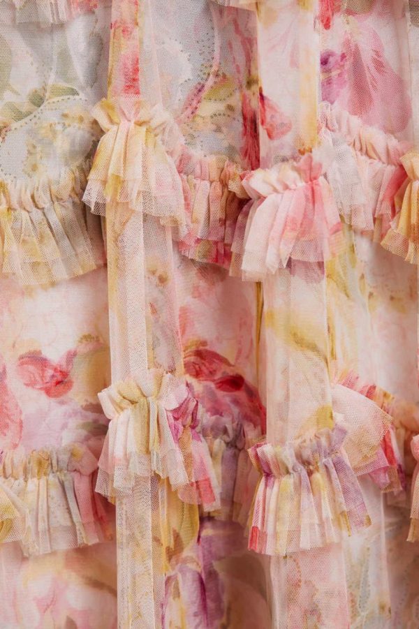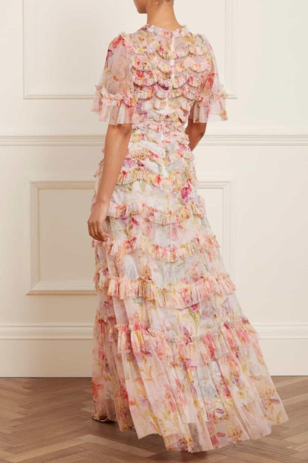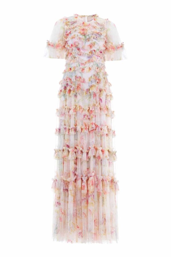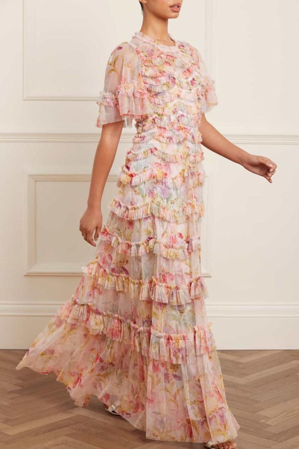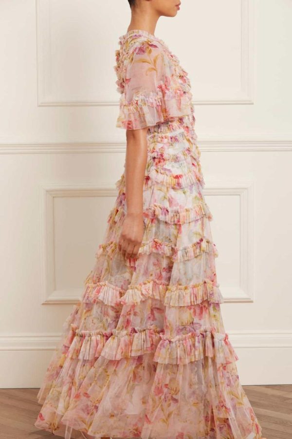 Make a stunning entrance in our Iris Ruffle Gown featuring a captivating Moonshine colorway. This exquisite gown showcases vibrant iris blooms and delicate daisy motifs inspired by authentic 1900s hand-painted artistry. Expertly crafted with intricate tulle scallop detailing that creates beautiful dimensional frills throughout. The romantic silhouette features gracefully floaty sleeves and a universally flattering cut that drapes beautifully. Perfect for weddings, galas, and any special occasion where you want to shine.