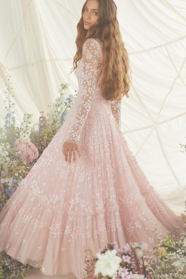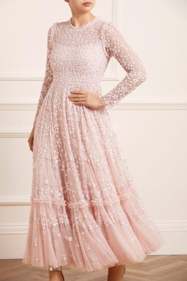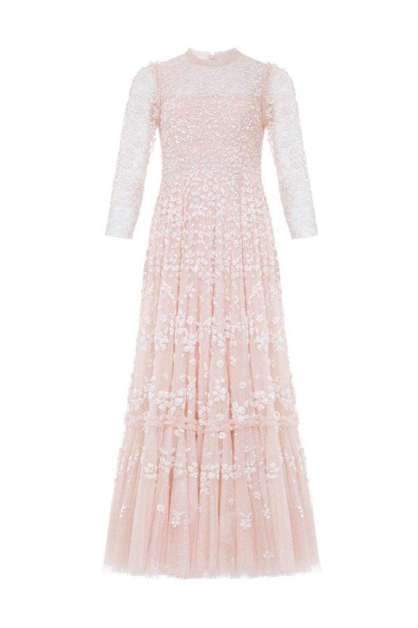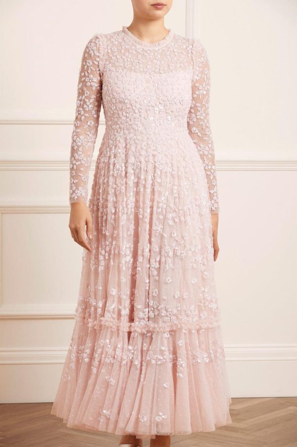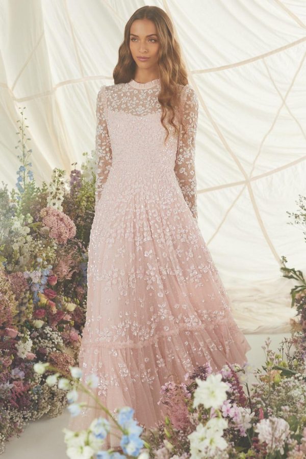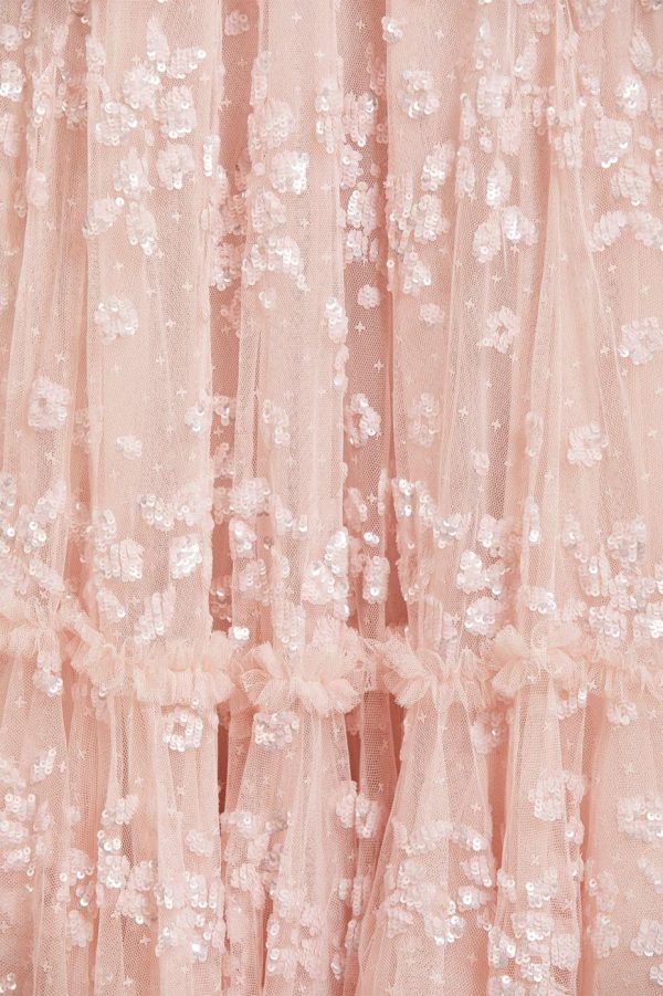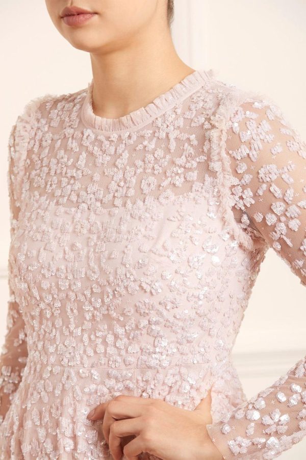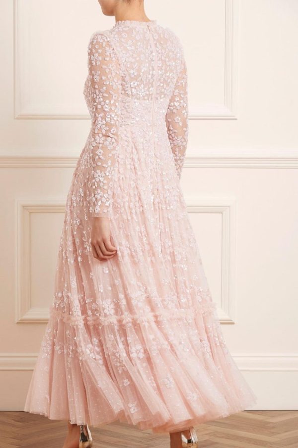 The Margot Ankle Gown in Petal Pink features exquisite floral sequin artwork that creates a captivating all-over shimmer effect. Designed with a dramatic, sweeping hemline that delivers elegant movement and romantic sophistication. Make a stunning entrance in this show-stopping formal gown perfect for special occasions.