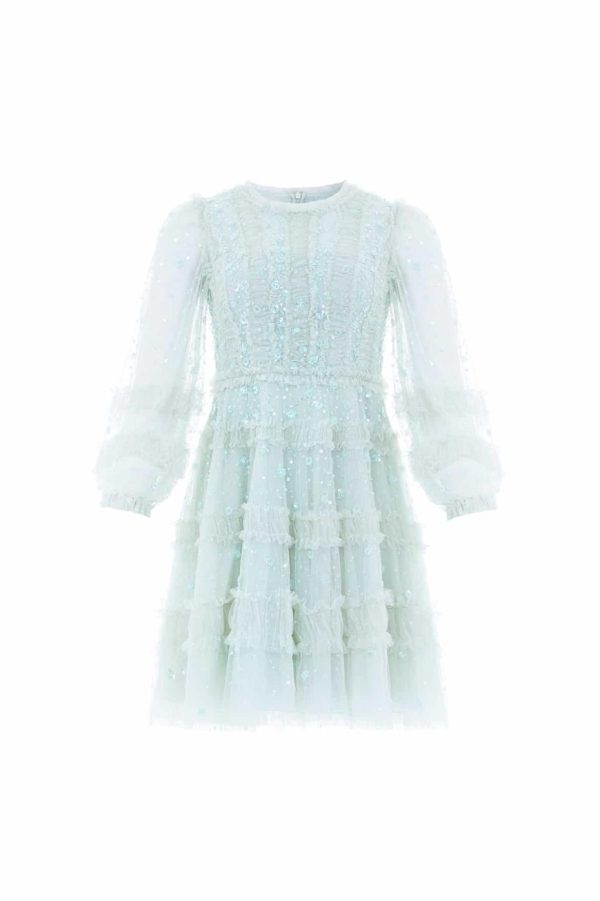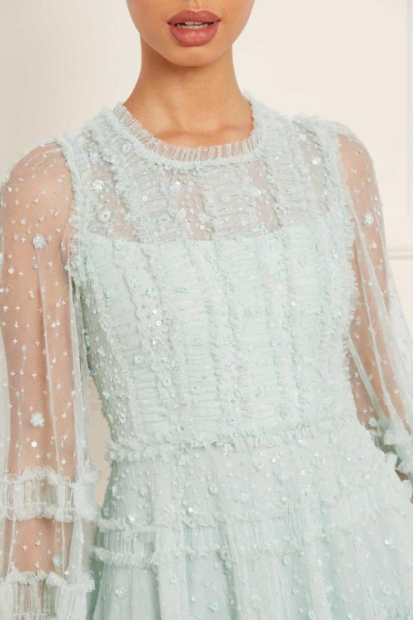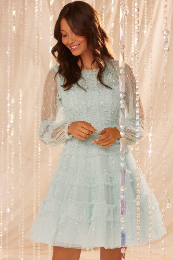 Make a dazzling statement in the Violet Shimmer Micro Mini Dress featuring a beautiful Spring Mint hue. This exquisite design showcases delicate shimmering sequin artwork that catches the light perfectly. The flattering silhouette is enhanced with elegant double-stitch ruffles that create beautiful dimension and movement. Crafted from premium kisses tulle with signature Needle & Thread attention to detail. Perfect for making a memorable entrance at any special occasion.