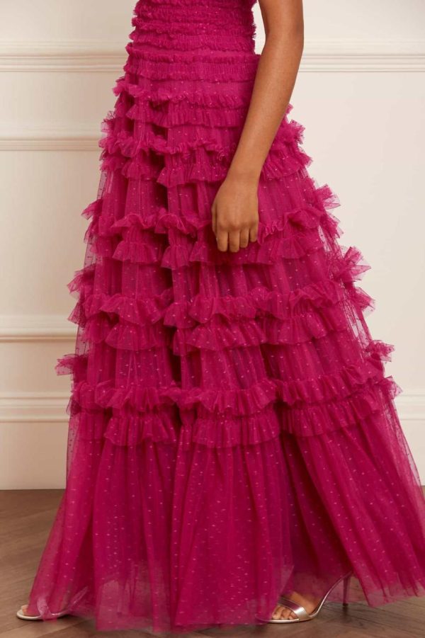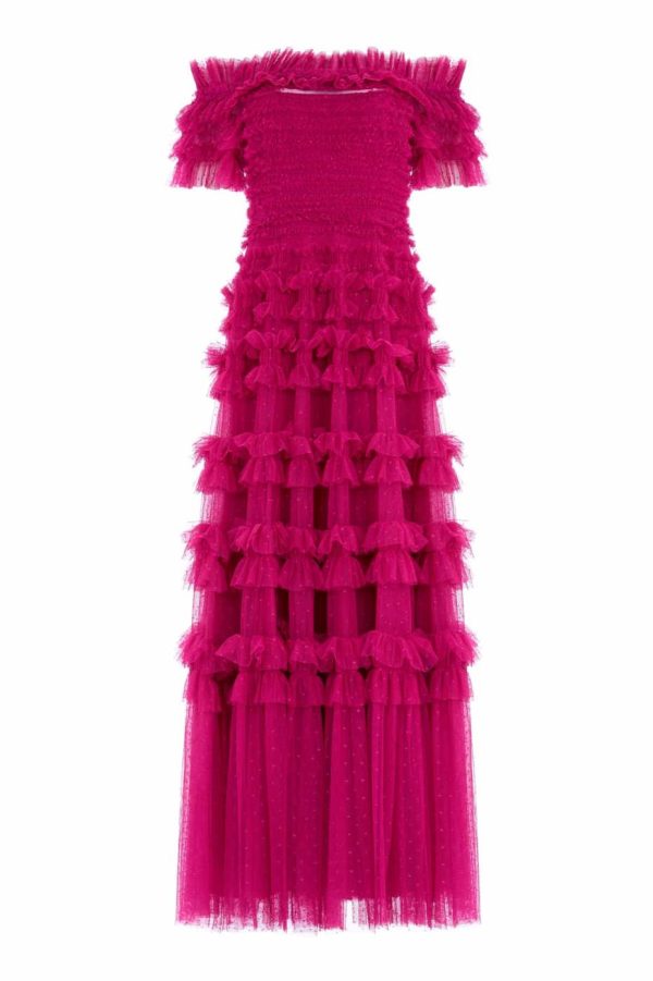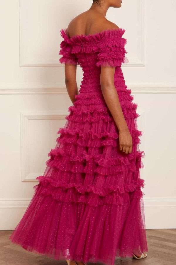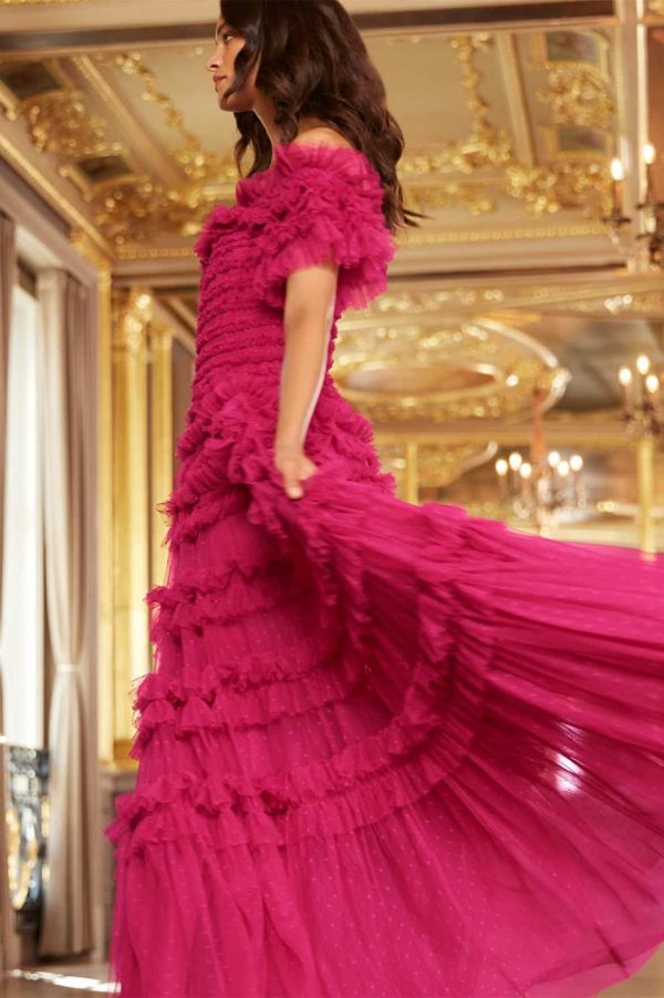 NEW SEASON. Make a stunning entrance in the Lisette Ruffle Off Shoulder Gown in Cerise. This breathtaking gown features a glamorous off-the-shoulder neckline inspired by classic Hollywood elegance. Expertly crafted with premium textile tulle and double-stitched frills that create a dramatic, romantic silhouette. Built-in corset ensures flawless shaping and exceptional comfort throughout your evening. Designed to turn heads and capture attention at any special occasion.