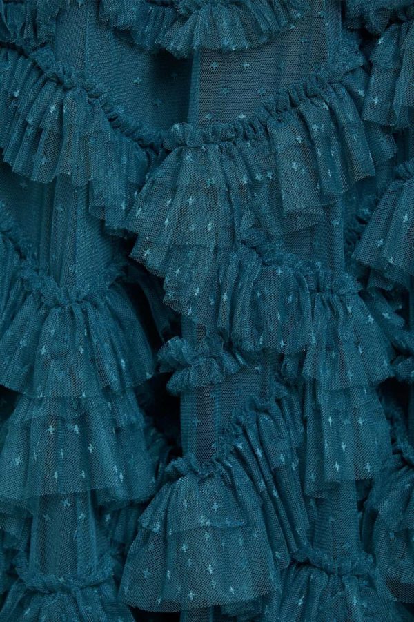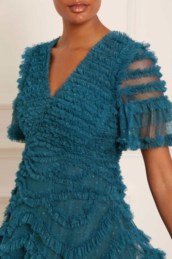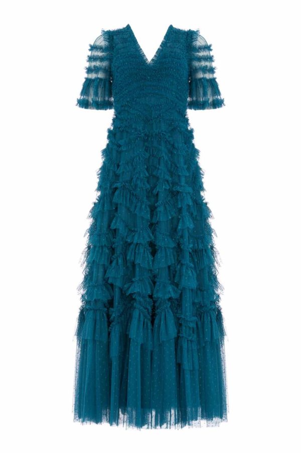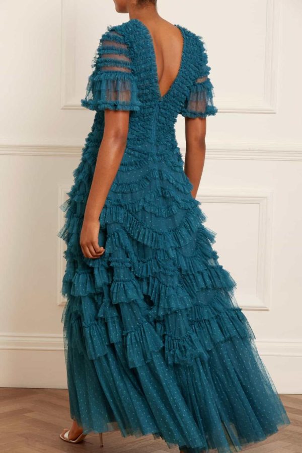 NEW SEASON. Introducing the stunning Phoenix V-Neck Gown in captivating teal. This exquisite evening dress showcases Needle & Thread’s signature craftsmanship with intricate detailing that commands attention. Beautifully designed with delicate tulle frills that gather softly to create romantic, textured dimension throughout. Expertly engineered with premium fabrics that provide an universally flattering silhouette for exceptional comfort and elegance.