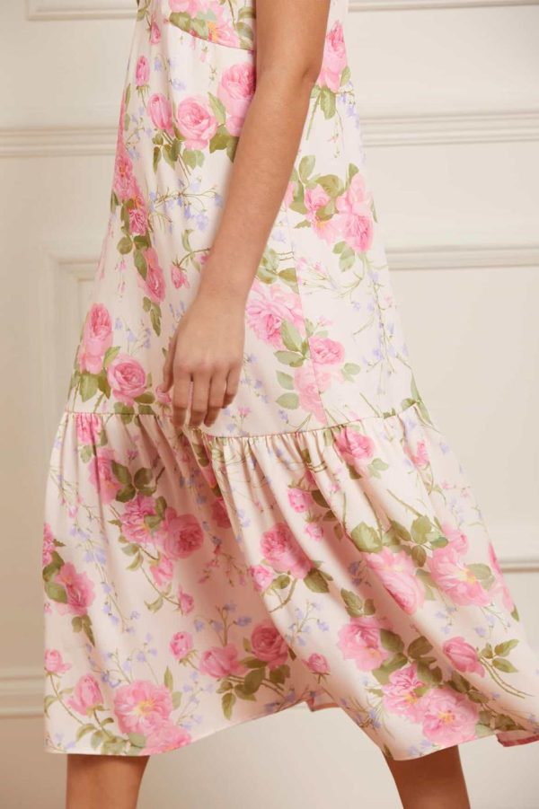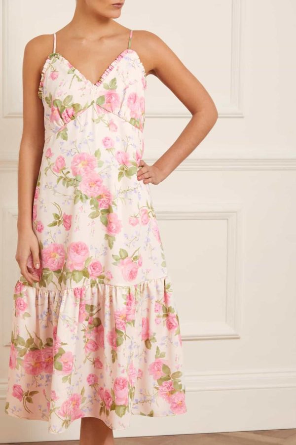 NEEDLE & THREAD EXCLUSIVE. Discover the stunning Rose Bluebell Cami Ankle Dress in Moonshine, featuring an exquisite summer print inspired by authentic 1900’s hand-painted artwork. This beautifully designed dress showcases delicate painted roses in an elegant, intertwining pattern that creates a timeless romantic look. Fully lined and crafted with a relaxed waist fit that provides both comfort and sophisticated silhouette. Perfect for making a statement at any summer occasion.