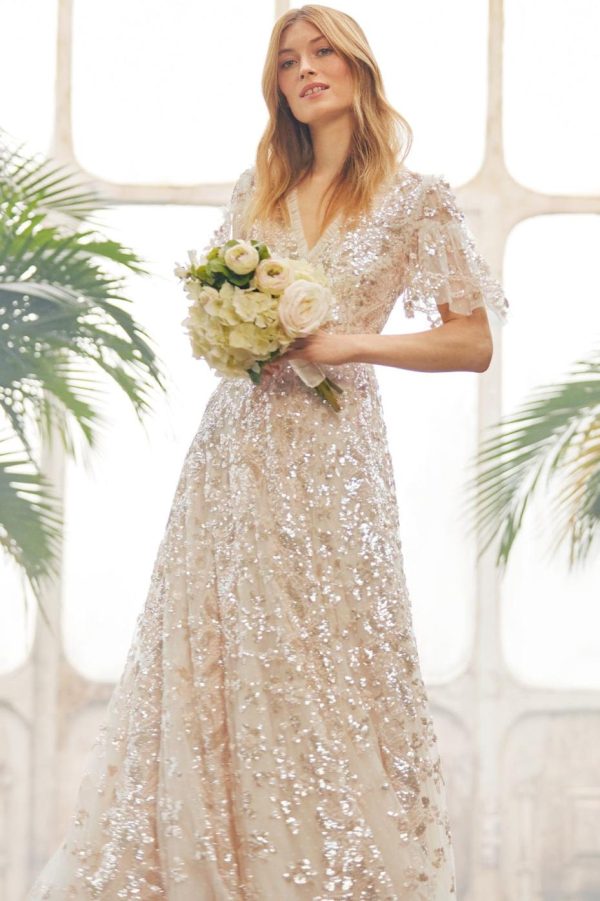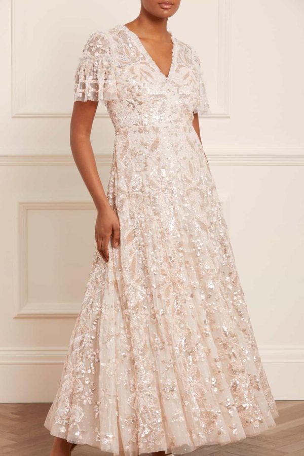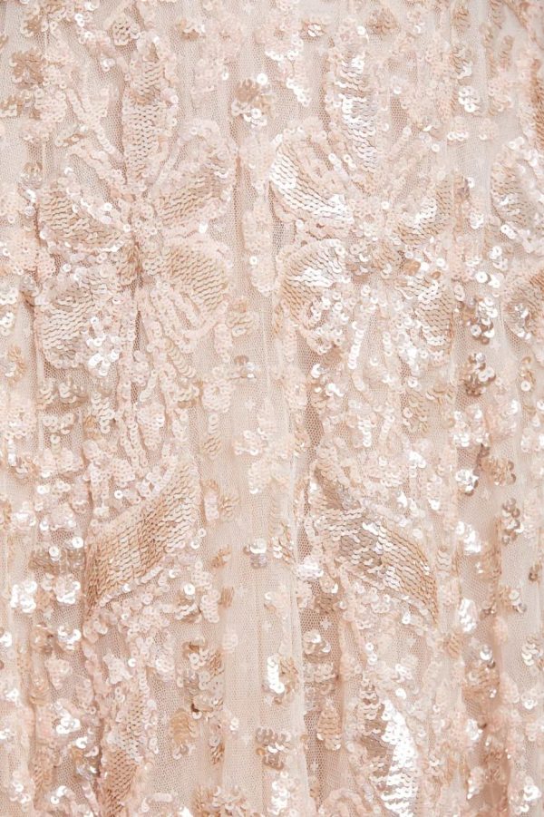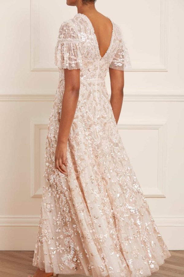 The exquisite Trailing Bow Gown in Cream makes a stunning statement for any formal occasion. This masterpiece showcases intricate ribbon bow detailing that cascades elegantly down the silhouette, complemented by delicate scattered floral and scallop motifs that add romantic charm. Expertly crafted with premium sequins that catch the light beautifully, creating a dazzling effect with every movement. Features a dramatic sweeping hemline constructed with multiple layers of luxurious tulle and net for exceptional volume and graceful flow. An unforgettable centerpiece gown designed to make you shine at your most special events.