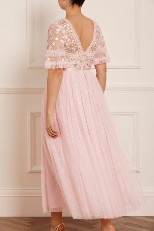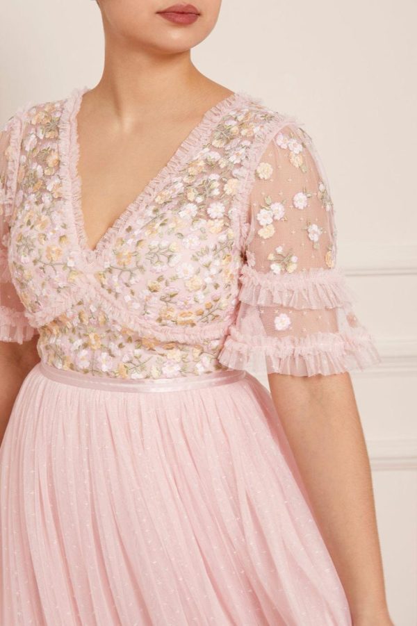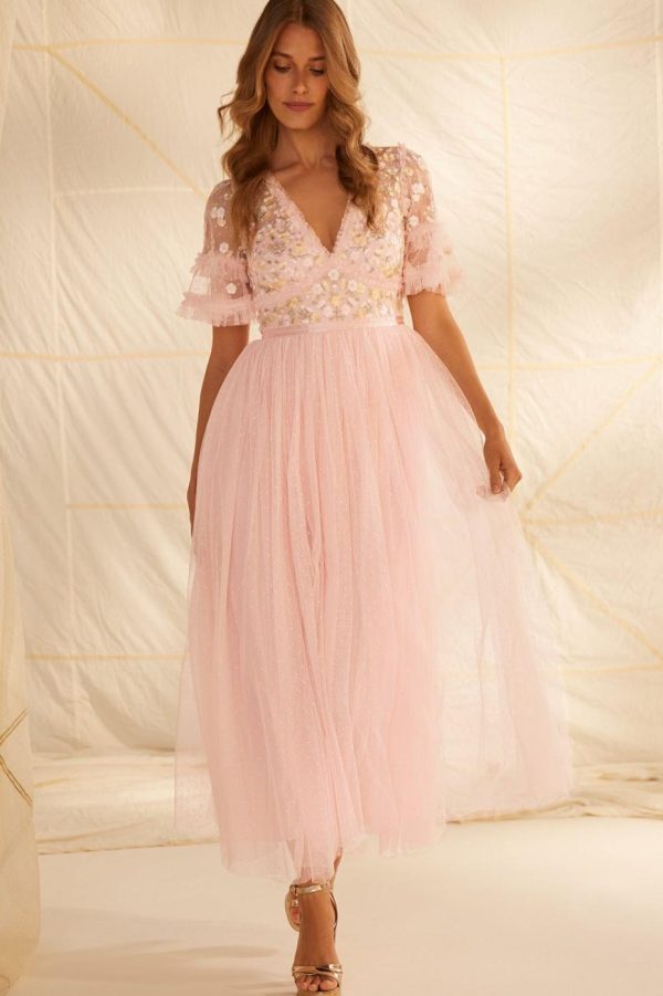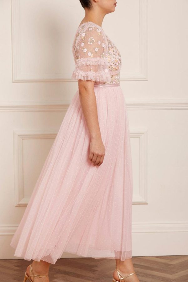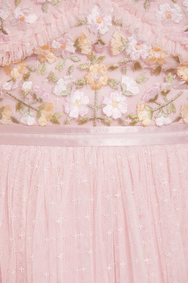 The Wildflower Ditsy Bodice Ankle Gown in Blush Pink / Primrose features an exquisitely crafted bodice with delicate floral embroidery in soft pastel shades, creating a romantic aesthetic. Designed with a dramatic statement skirt featuring layers of tulle net for beautiful volume and movement. This stunning gown makes an unforgettable impression for special occasions.