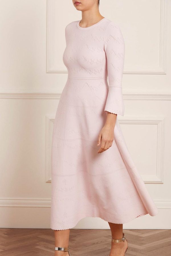 Discover the exquisite Pretty Pointelle Knit Ankle Gown in soft Pink, a stunning new addition to the Needle & Thread collection. This beautifully crafted knitted gown captures the timeless elegance of vintage floral patterns and delicate lacework. Featuring intricate all-over pointelle stitching, charming floral motifs, and graceful scalloped detailing, this gown offers a perfect blend of sophistication and comfort. The fitted stretch bodice with a soft round neckline, elegant fluted cuffs, and signature Needle & Thread craftsmanship creates a truly flattering silhouette that moves beautifully with you.