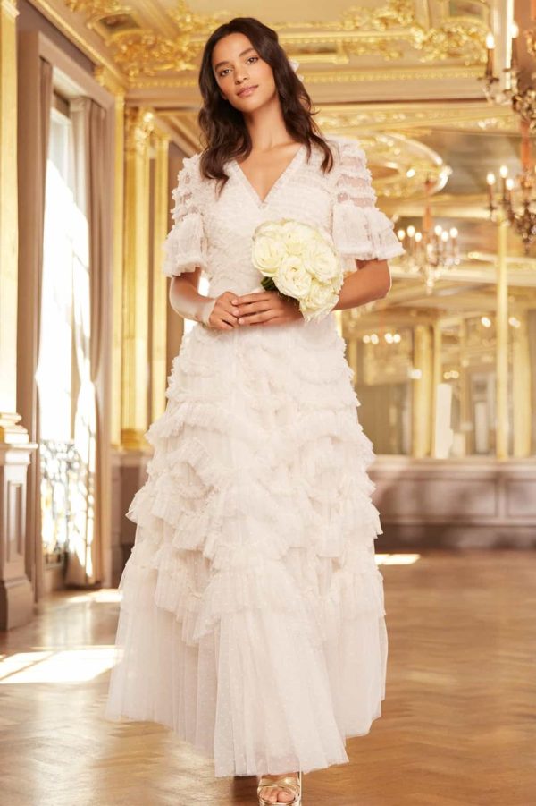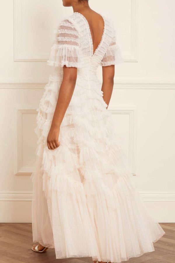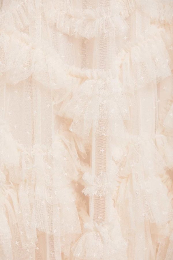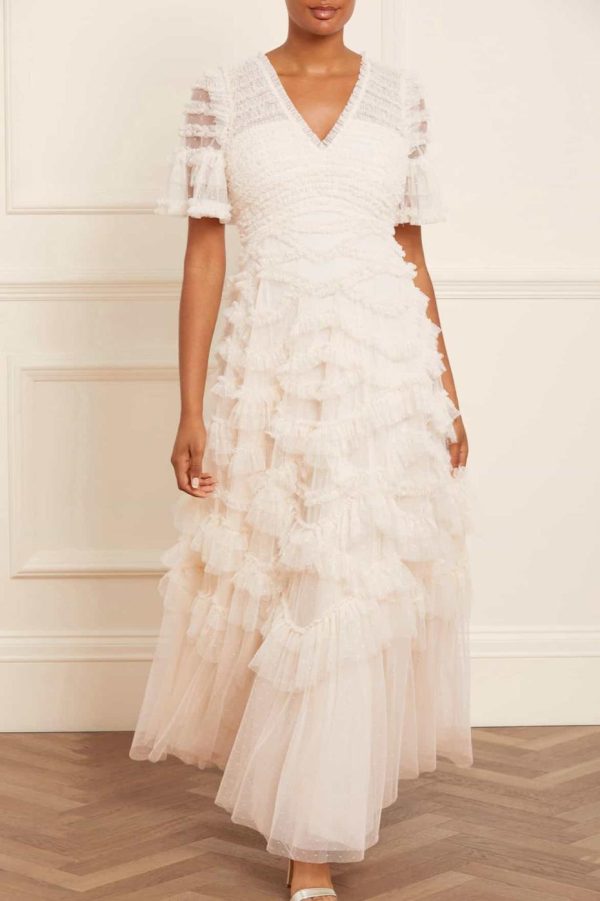 NEW SEASON ARRIVAL. The Phoenix V-Neck Gown in elegant Champagne hue showcases signature Needle & Thread craftsmanship. Expertly designed with delicate tulle frills that gather softly to create captivating romantic texture throughout. This stunning gown features precision engineering with an all-over flattering silhouette that enhances every curve. Our design team celebrates the Phoenix as a standout piece for special occasions.