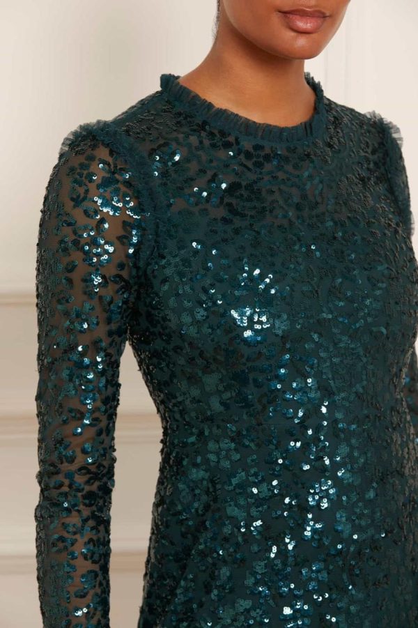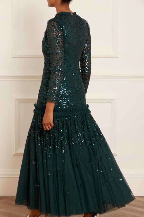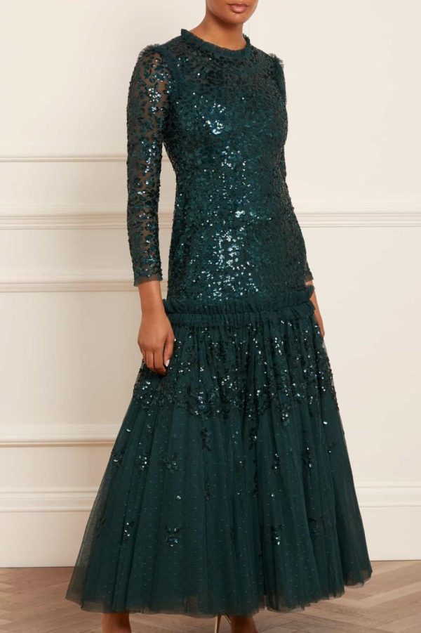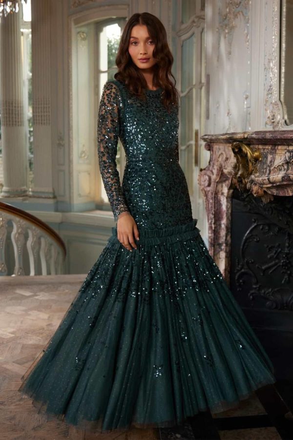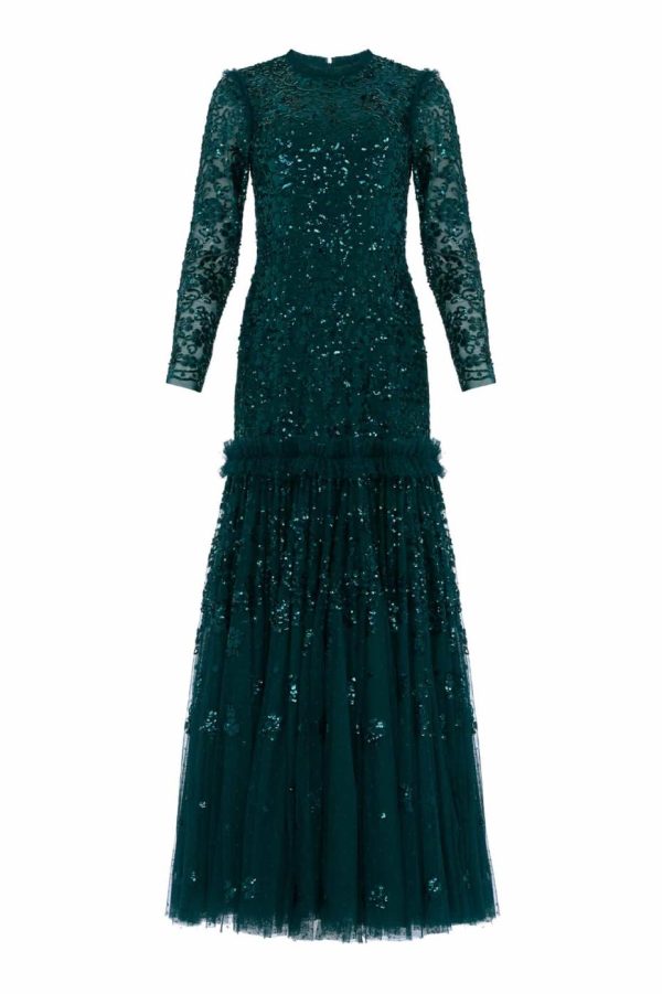 NEW SEASON ARRIVAL. The Regal Rose Gloss Long Sleeve Gown in stunning Emerald green makes a dramatic statement with exquisite floral embroidery and delicate lace accents. Designed with a beautifully fitted bodice that transitions into a show-stopping full skirt. Crafted with multiple layers of our signature tulle and net fabric for a luxurious, romantic texture that moves beautifully. The ultimate statement piece to transform your evening wardrobe.