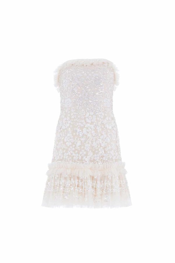 NEW SEASON. Introducing the stunning Regal Rose Gloss Strapless Micro Mini Dress in a luxurious champagne hue. This exquisite Needle & Thread creation features intricate floral embroidery and delicate lace detailing that creates an unforgettable visual impact. Designed with a supportive fitted corset bodice that transitions into a dramatically full skirt, this dress ensures both comfort and show-stopping style. The internal corset construction incorporates reinforced ribbon stitching, flexible boning, and stretch mesh panels for exceptional fit security and all-day comfort. Perfect for making a memorable entrance at weddings, galas, or any special occasion.