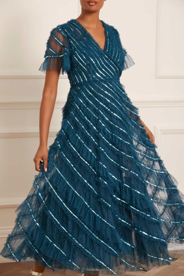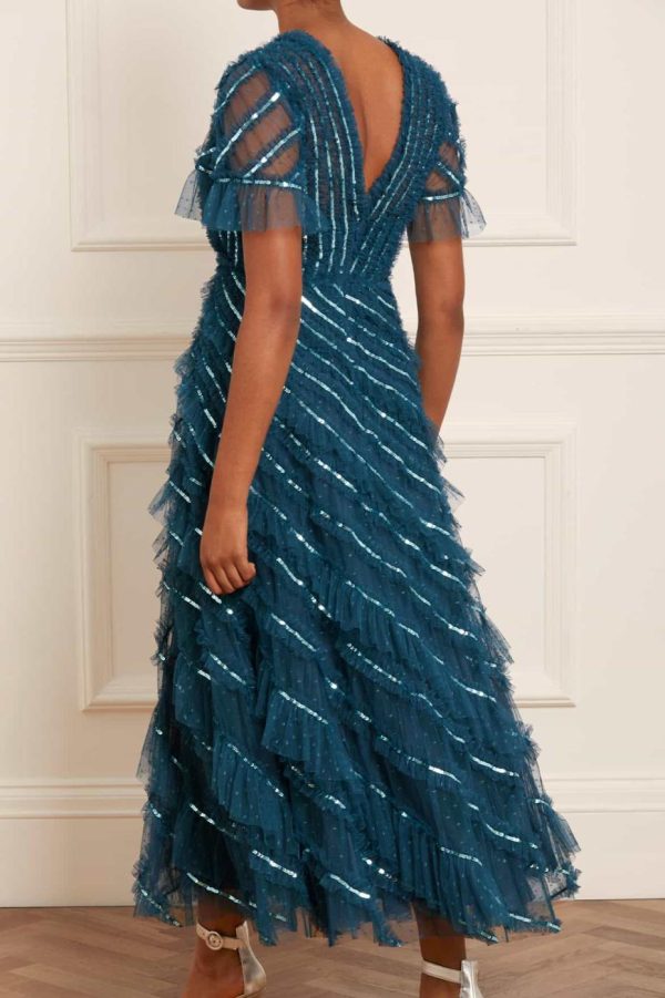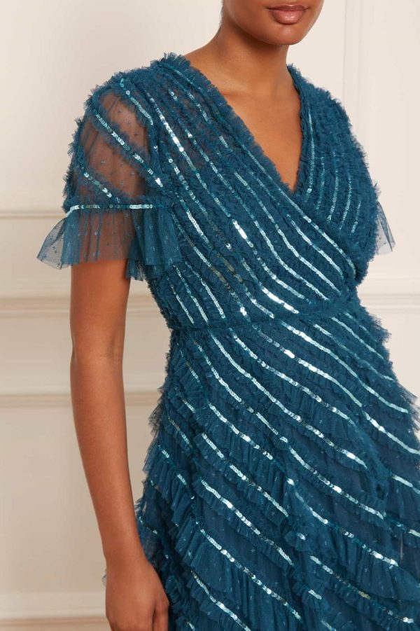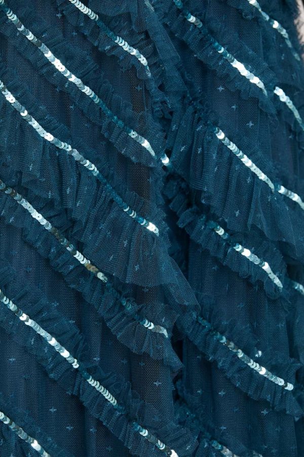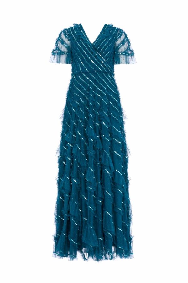 NEW SEASON. Introducing the stunning Spiral Sequin V-Neck Ankle Gown in captivating teal. This brand new design delivers the ultimate statement look for your most memorable evenings. Experience the luxurious texture that creates Needle & Thread’s signature aesthetic, featuring beautifully engineered spiral gathers and intricate shimmering sequins that adorn each individual frill for a truly mesmerizing effect. Command attention in this breathtaking romantic gown perfect for black-tie events and special occasions.