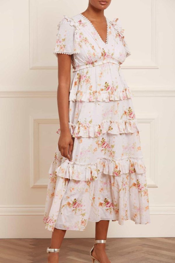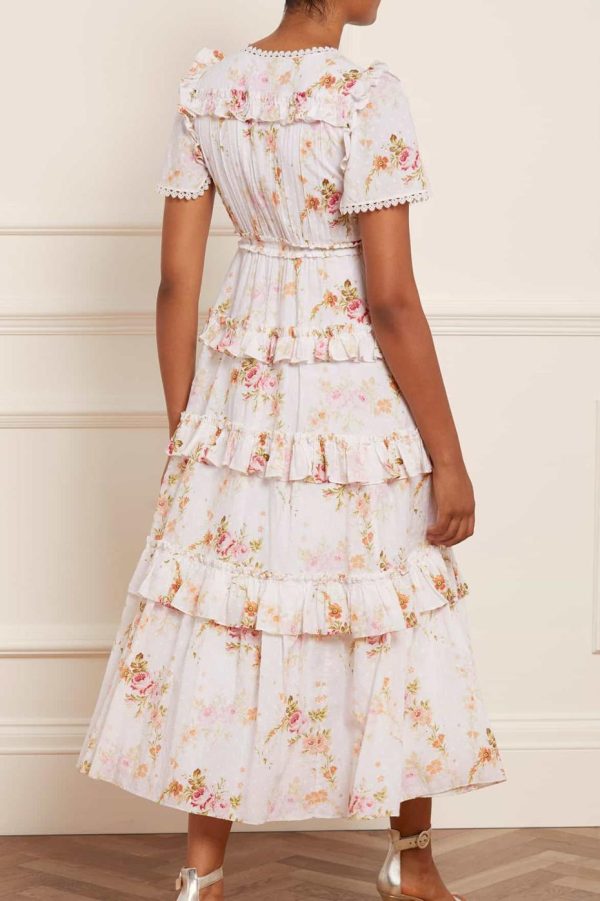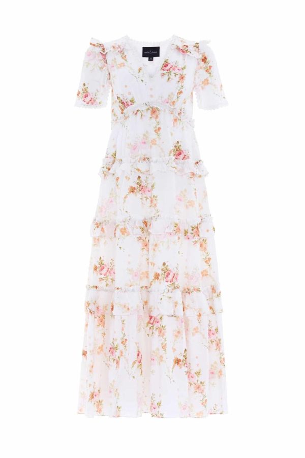 Discover the exquisite Trailing Blooms Cotton Lace Ankle Gown in Moonshine. This stunning printed evening gown showcases a delicate floral motif in soft pink hues, drawing inspiration from authentic 1900’s hand-painted artwork. Crafted from our premium soft cotton fabric with subtle dobby weave that adds elegant texture and dimension. Features signature Needle & Thread gathered ruffles for a sophisticated contemporary silhouette. Complete your elegant look with an on-trend hair ribbon for the perfect finishing touch.