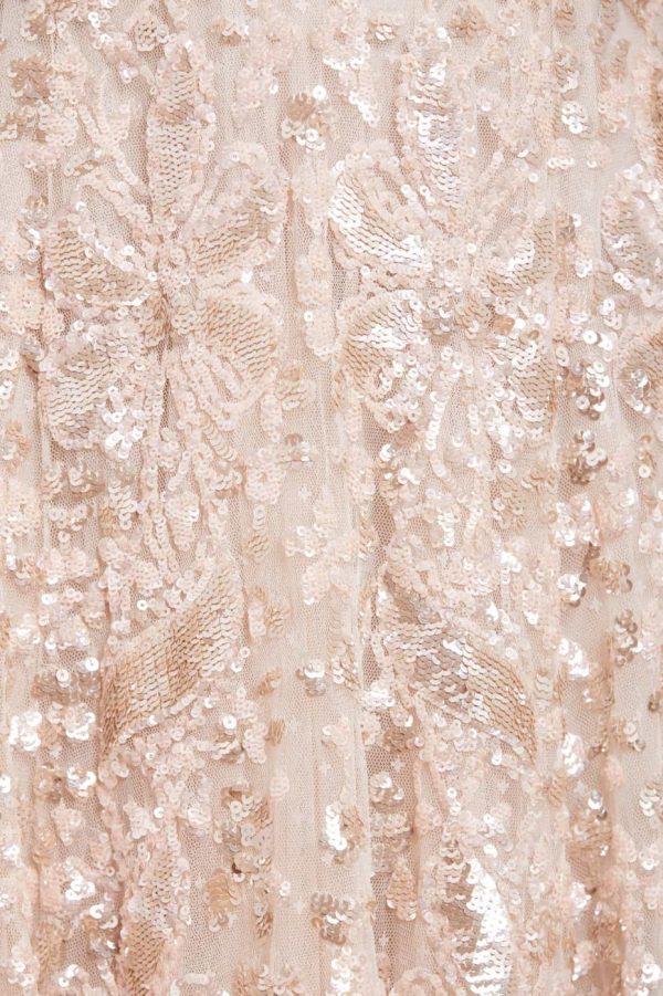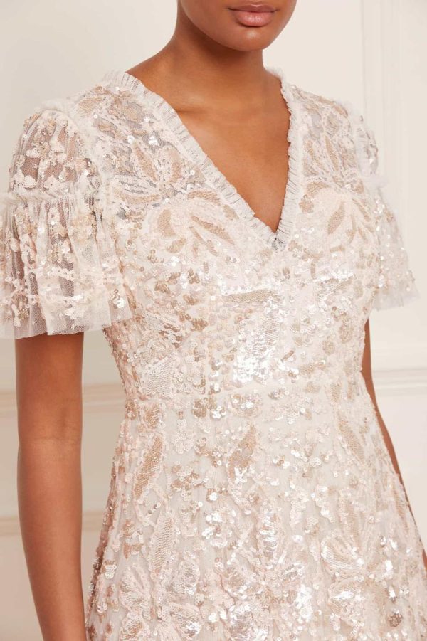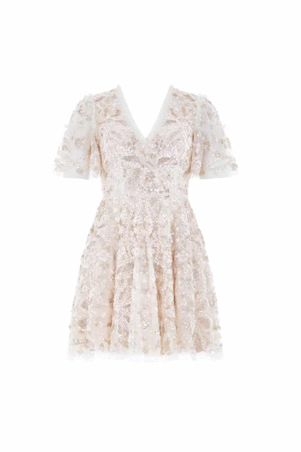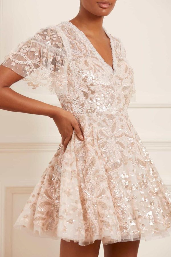 The Trailing Bow Micro Mini Dress in Cream makes a stunning statement with its exquisite ribbon bow detailing that gracefully cascades down the silhouette. This eye-catching design features romantic scattered floral motifs and delicate scallop accents, all enhanced with specially sourced sequins that create brilliant sparkle with every movement. The dramatic sweeping hemline combines layers of tulle and net for unforgettable volume and motion, making this the perfect show-stopping piece for your next special occasion.