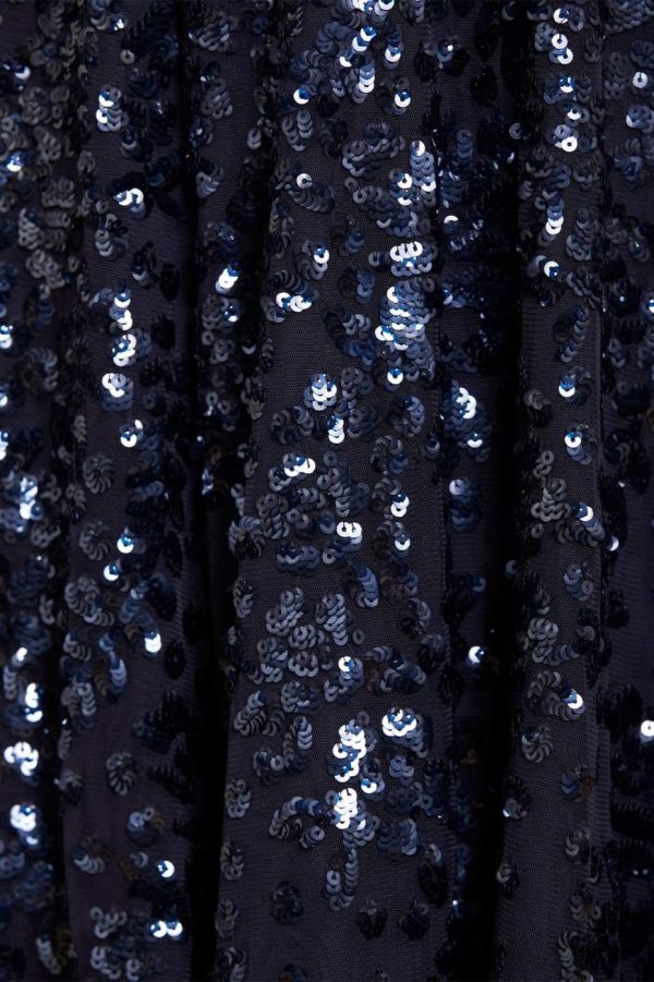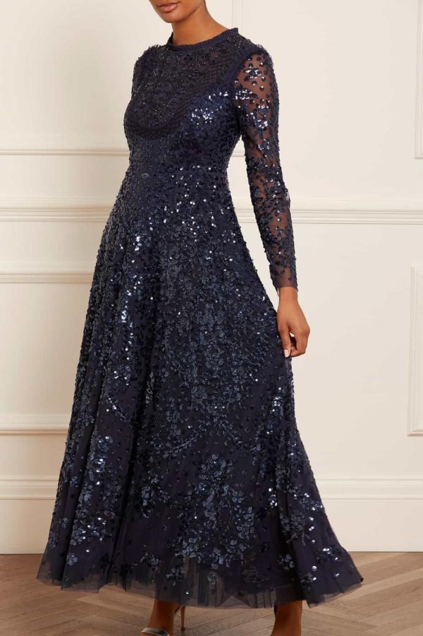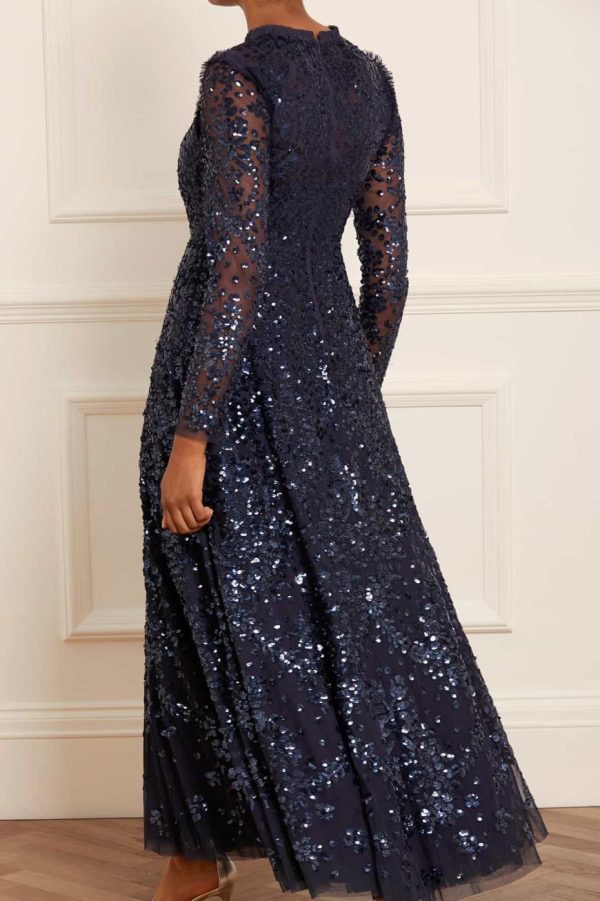 NEW SEASON. Introducing our stunning Victorian Wreath Gloss Long Sleeve Gown in sophisticated Navy. This exquisite gown captures the elegance of Victorian-inspired paneling details, beautifully adorned with intricate sequin artwork featuring delicate floral and bow motifs arranged in a graceful repeated wreath pattern. Needle & Thread has specially sourced premium sequins with enhanced foil coating to deliver an exceptional high-shine finish that catches the light beautifully. Perfect for making a memorable statement at your next special occasion.
