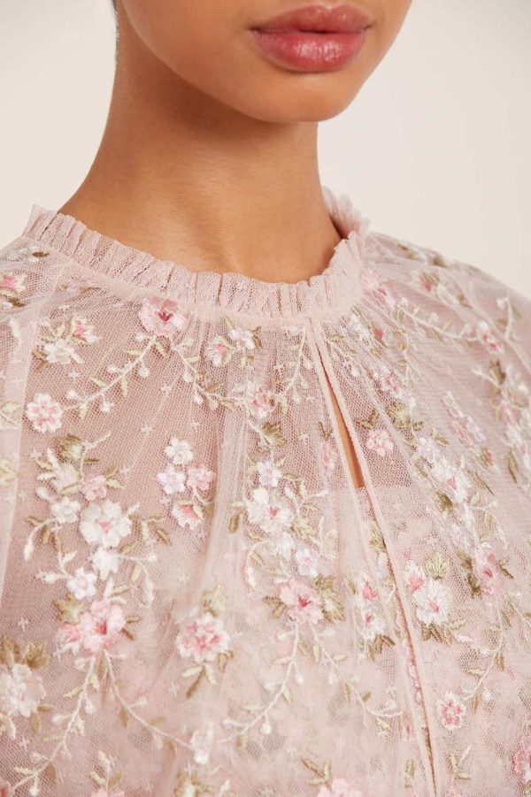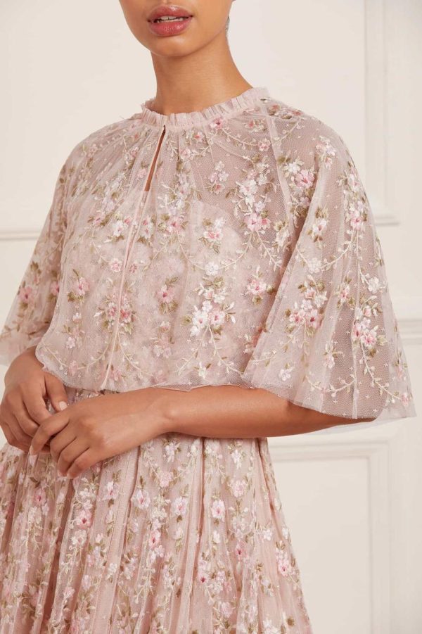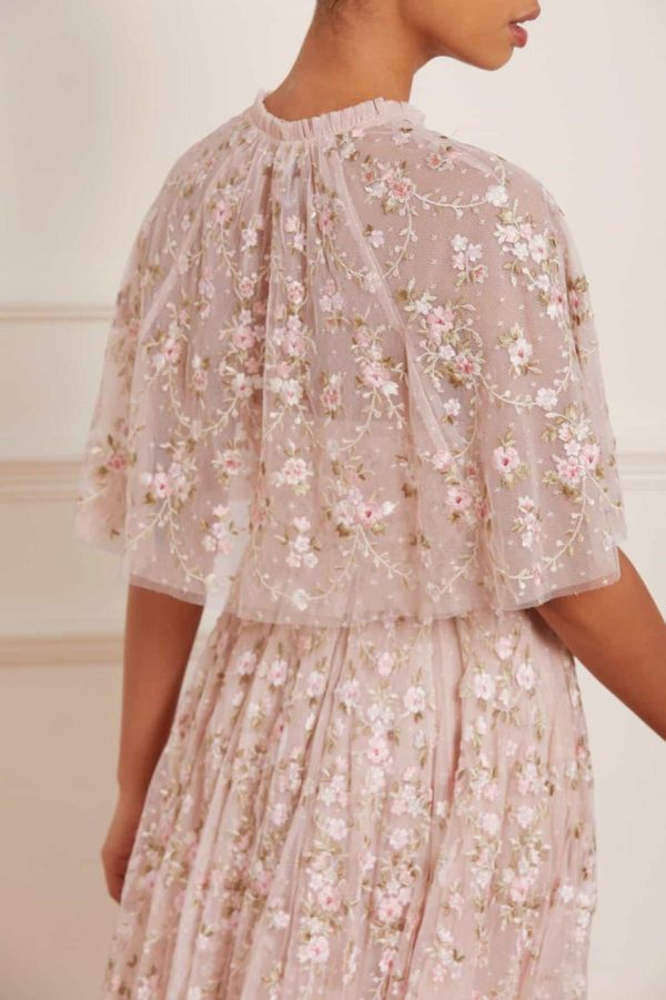 The Victoria Ditsy Short Cape in Petal Pink / Multi. This short cape is intricately designed with floral motifs and scallop shape motifs in rich, multi-coloured embroidery. Developed with a hook fastening at the neckline to allow the cape to sit perfectly. Make this cape your new styling piece. Pair this cape with the Victoria Ditsy Strapless Ankle Gown to complete the look.