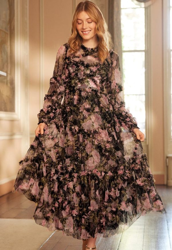 The English Rose Diamond Ruffle Ballerina Dress in Graphite. This ballerina dress is inspired by a traditional rose print taken from a 1900s hand-painted artwork, in soft hues of deep pinks. Developed with signature Needle & Thread styling featuring perfectly engineered frills for all-over delicate texture. The perfect dress to take you from dinner to the dancefloor.