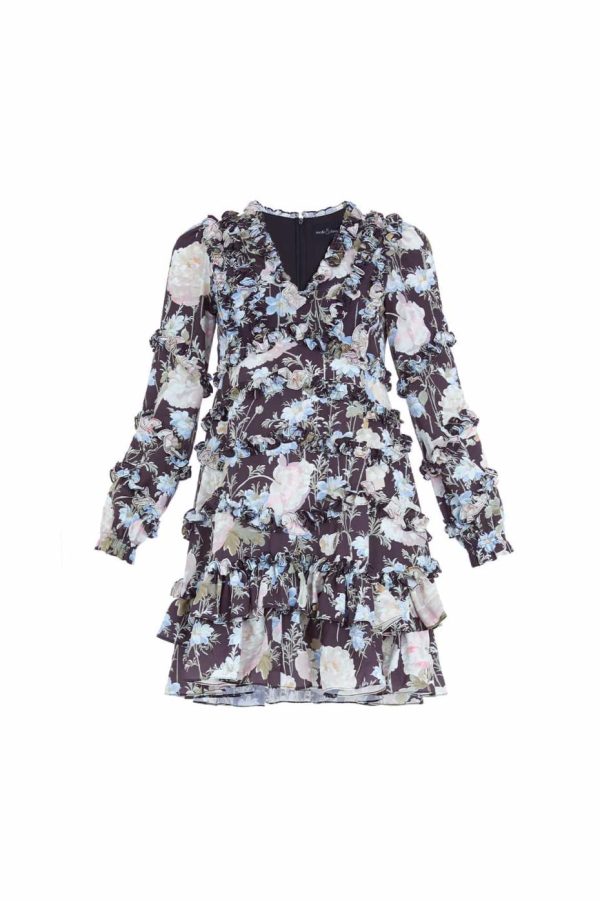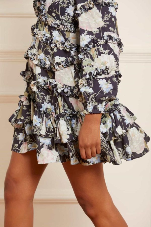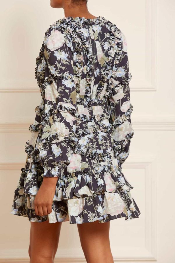 NEW SEASON. The Moonlight Petals V-Neck Crepe Micro Mini Dress in Graphite. The print of this dress is taken from a 1900’s hand-painted artwork. Beautifully printed with soft white peonies and silvery blue wildflowers creating an enchanting print. This mini dress is adorned with ruffles creating signature Needle & Thread detailing. Crafted on soft crepe fabric for an easy-to-wear piece. You can dress the Moonlight up or down depending on the occasion.