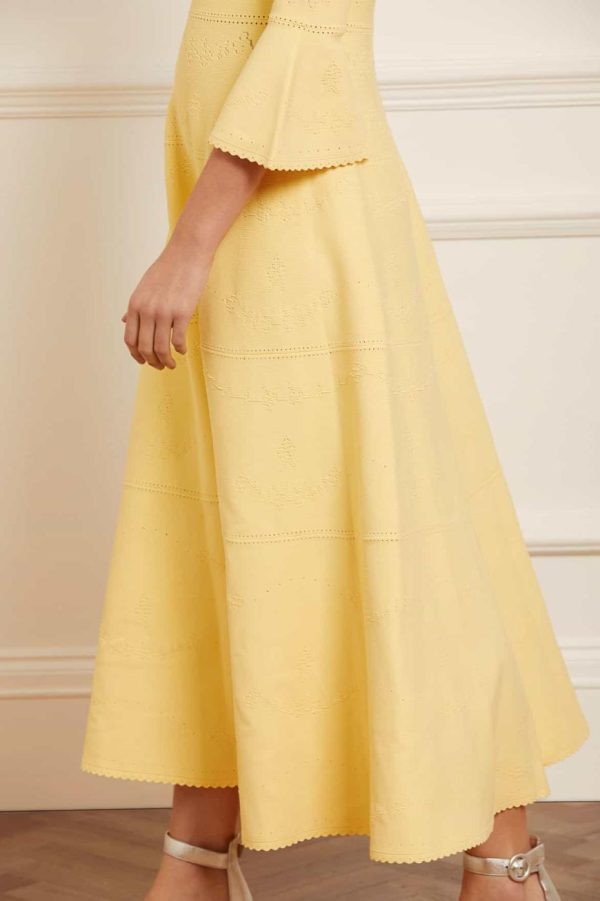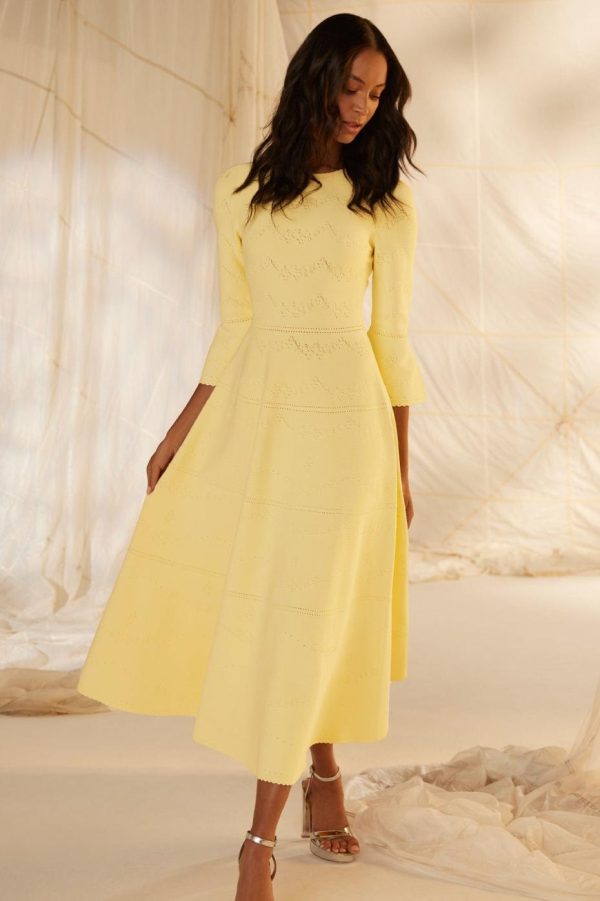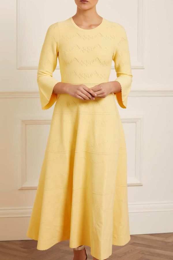 The Pretty Pointelle Knit Gown in Lemon. A brand new style for Needle & Thread. This knitted gown is inspired by vintage ditsy florals and lace. Beautifully designed with all-over pretty pointelle stitch, delicate florals and scallop details. This gown has a fitted stretch bodice with a soft, round neckline, fluted cuffs and signature Needle & Thread detailing. A truly flattering piece.