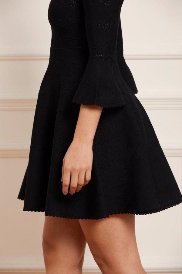 The Pretty Pointelle Knit Scoop Neck Mini Dress in Black. A brand new style for Needle & Thread. This knitted dress is inspired by vintage ditsy florals and lace. Beautifully designed with all-over pretty pointelle stitch, delicate florals and scallop details. This dress has a fitted stretch bodice with a soft, feminine neckline, fluted cuffs and signature Needle & Thread detailing. A truly flattering piece.