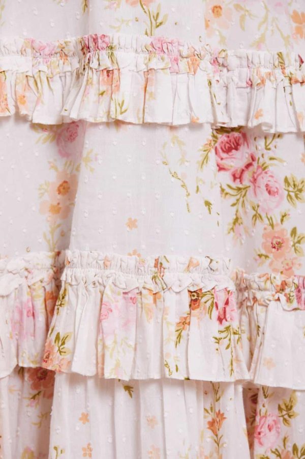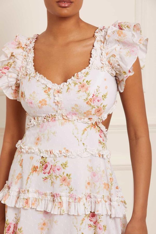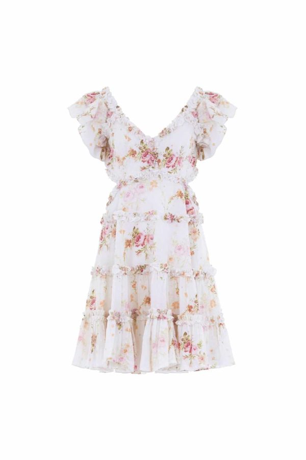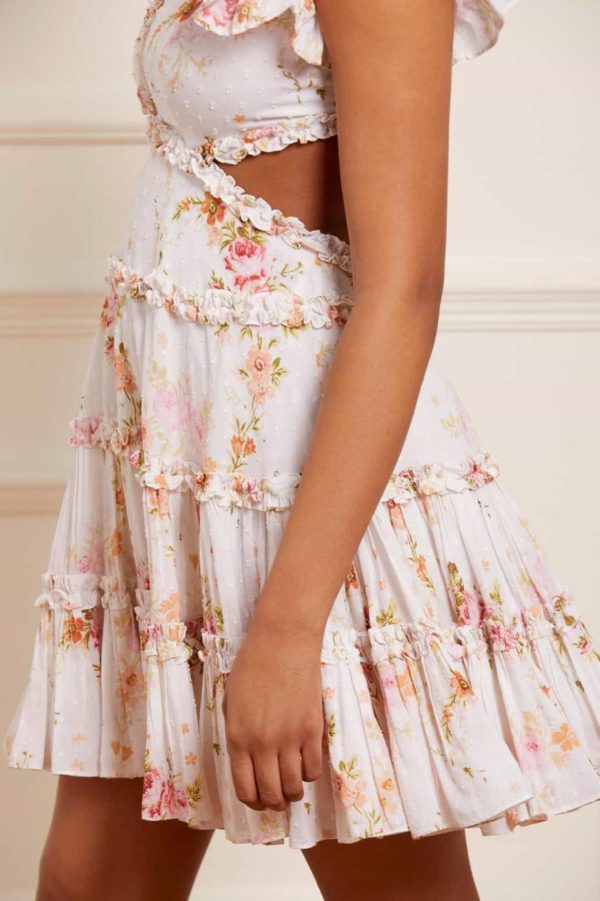 The Trailing Blooms Cotton Backless Micro Mini Dress in Moonshine. This beautifully printed dress is designed with a floral motif in soft pink tones, inspired by a hand-painted 1900’s artwork. Developed on our soft cotton fabric featuring subtle dobby weave to add gentle texture. Adorned with pretty tulle details, frills and signature detailing for a romantic edge. Beautifully created with a striking silhouette and shaped with a backless design for further intrigue. Style with an on-trend ribbon in your hair to complete the look.