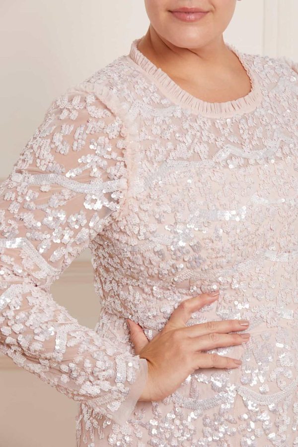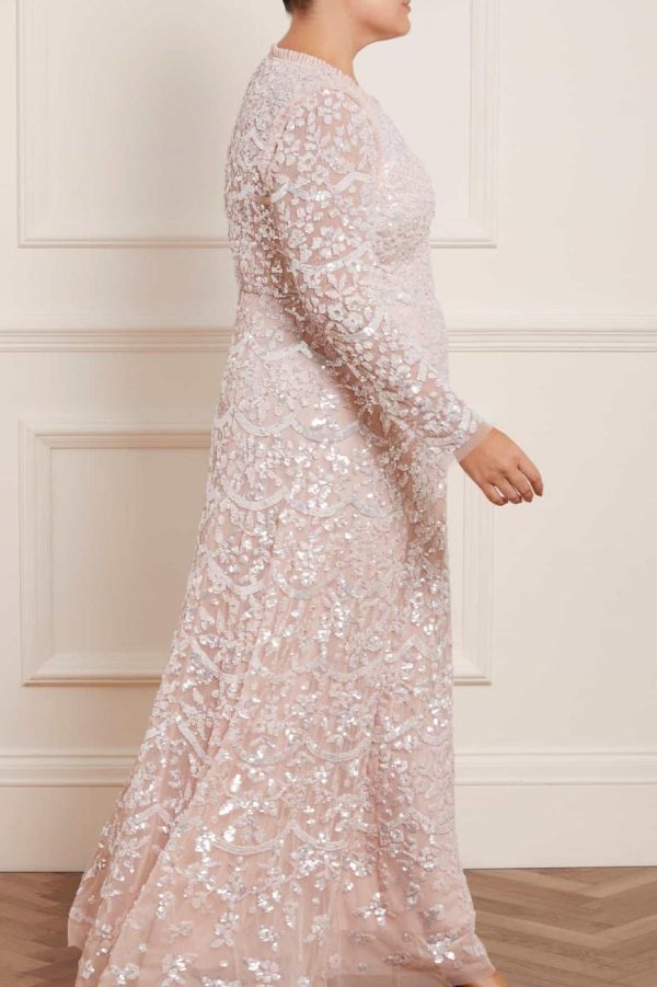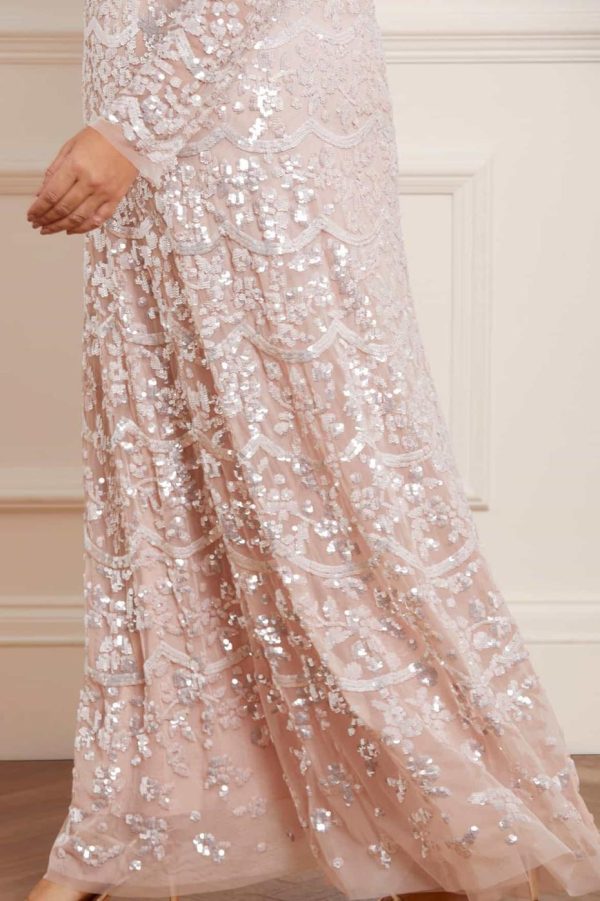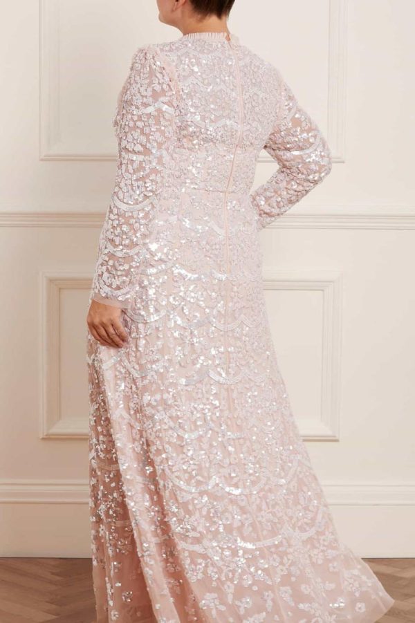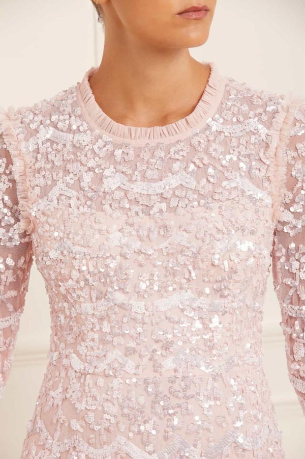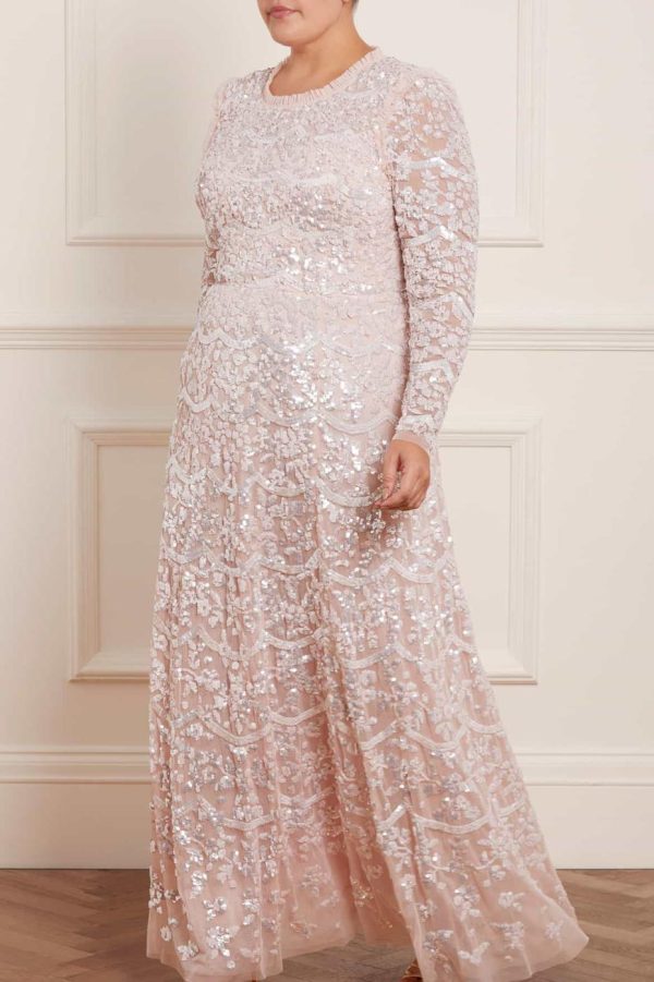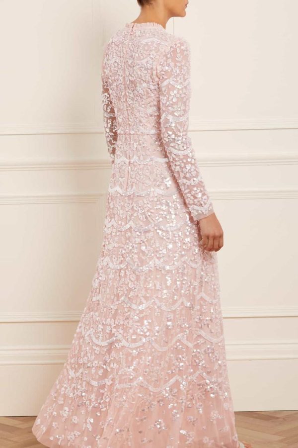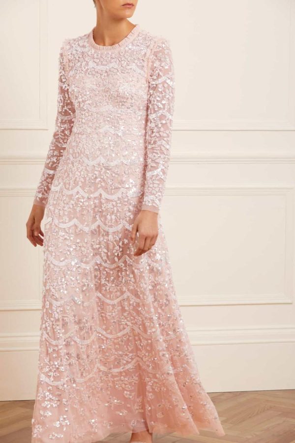 NEEDLE & THREAD EXCLUSIVE. The Alicia Scallop Gown in Petal Pink. A signature Needle & Thread shape for the season ahead. Decorated with lustrous sequins, creating a pretty, shimmering effect. This gown features beautiful artwork, with carefully positioned scallop stripes and floral motifs. You’ll be reaching for this gown time and time again.
