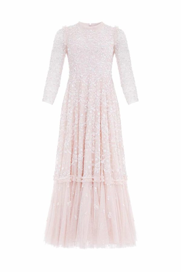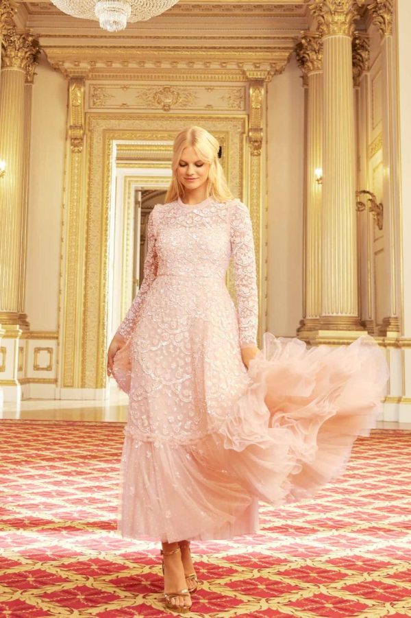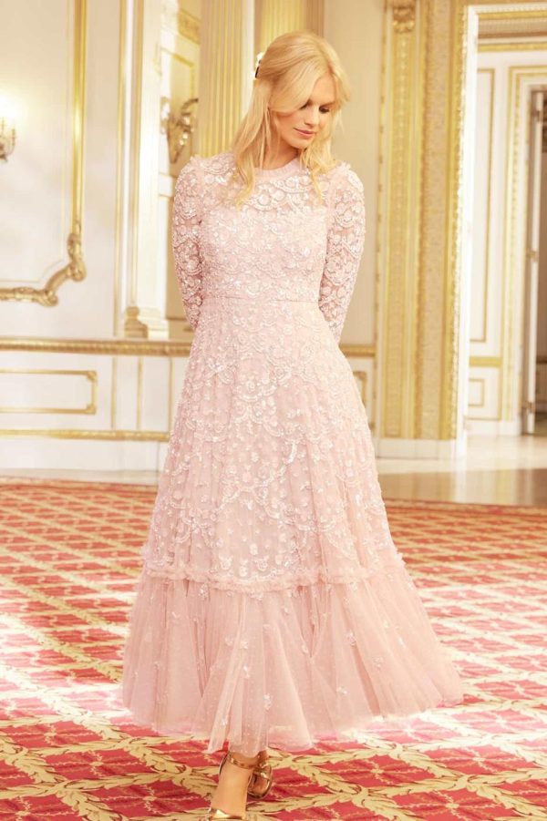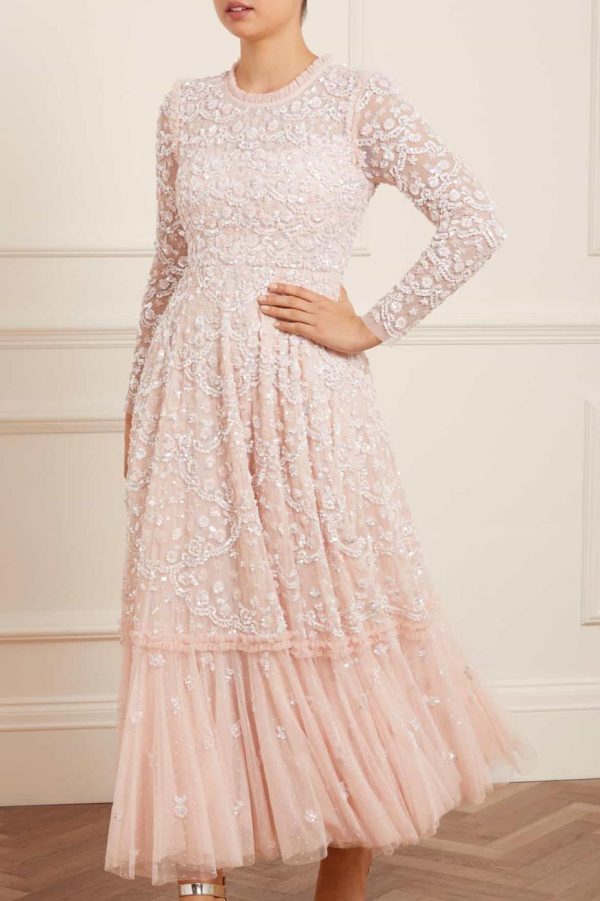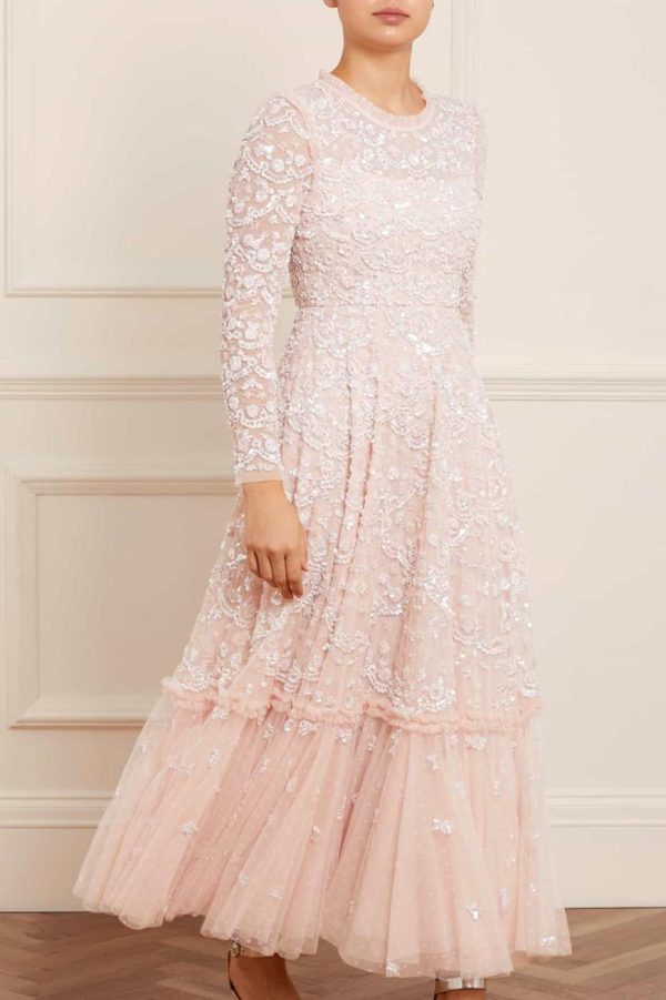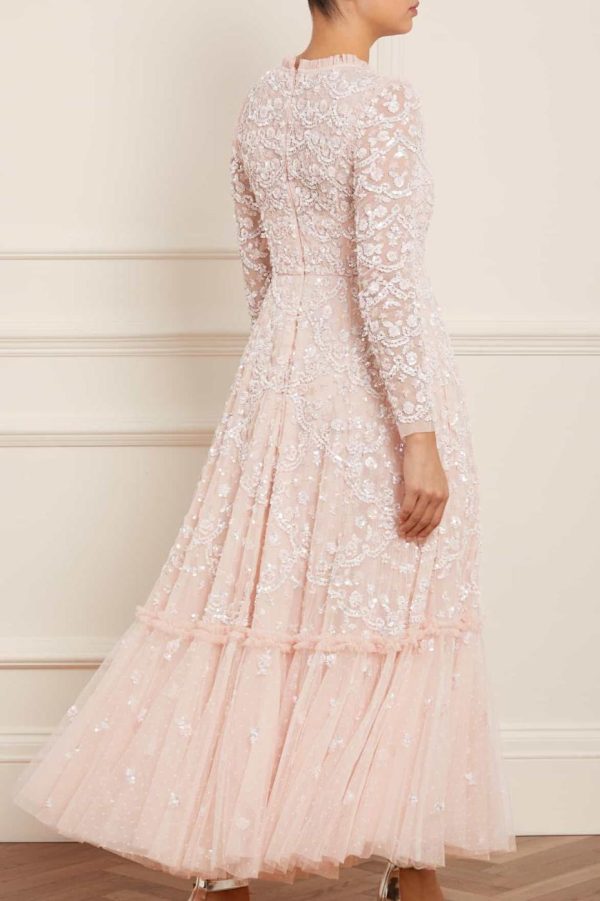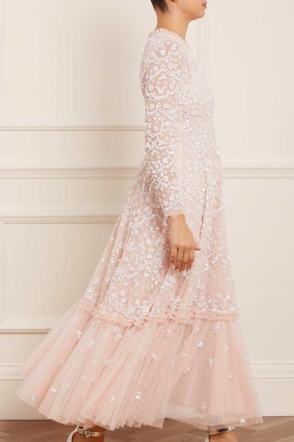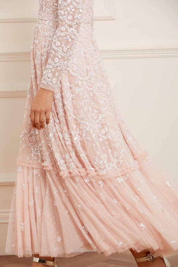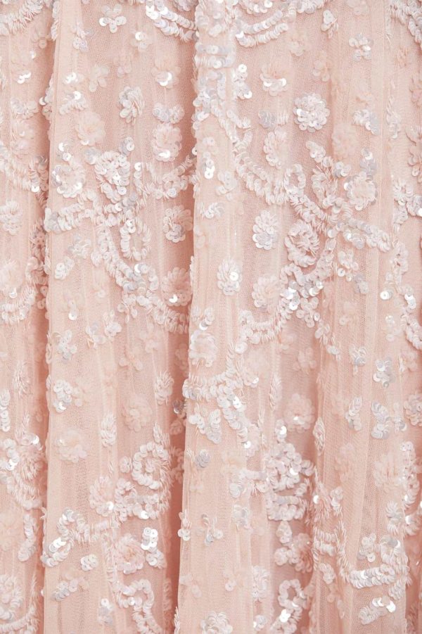 The Alina Sequin Ankle Gown in Petal Pink. Taking inspiration from the 1940s, this intricately embellished ankle gown is designed with delicate sequins and interlocking scallop shapes, creating texture. Decorated with high impact, lustrous sequins for a shimmering effect throughout. This gown features a generous sweeping skirt hem with additional underlayers of delicate tulle and net for volume. A truly beautiful statement piece.