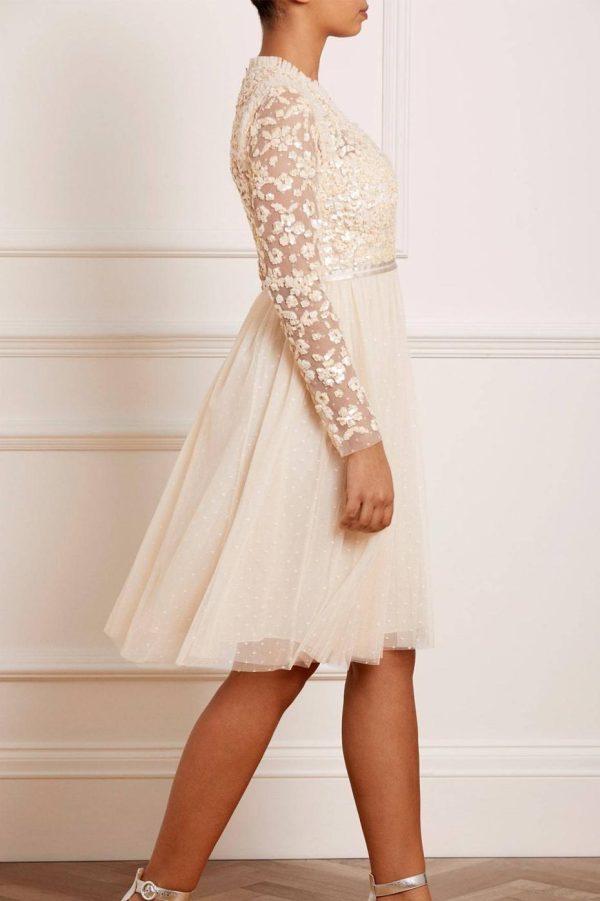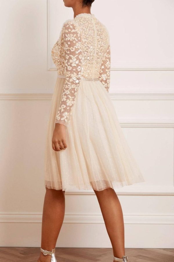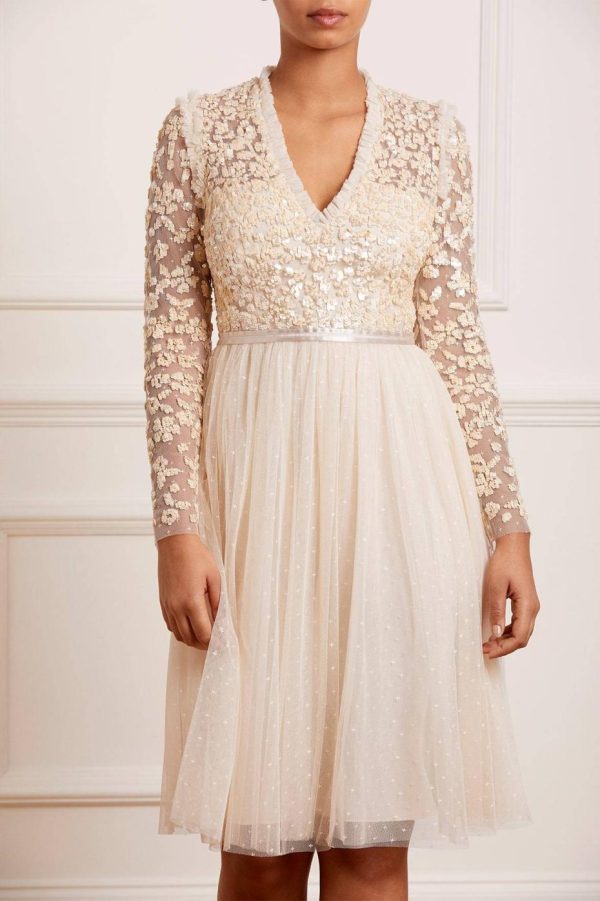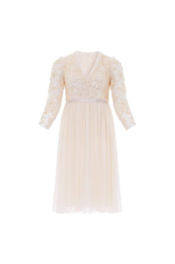 NEEDLE & THREAD EXCLUSIVE. The Amalie Bodice Long Sleeve V-Neck Midi Dress in Champagne. Featuring a bodice decorated with intricate shimmering sequins and floral motifs, this long-sleeved, V-neck dress is designed with a layered tulle skirt featuring ‘x’ motifs throughout, adding subtle texture. Make this dress your new season go-to.