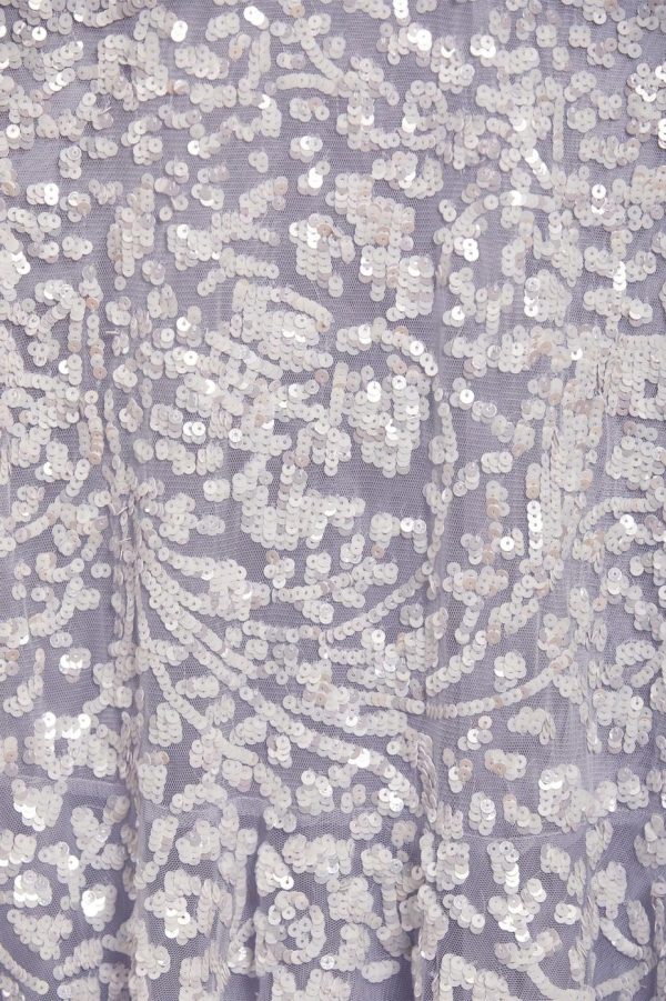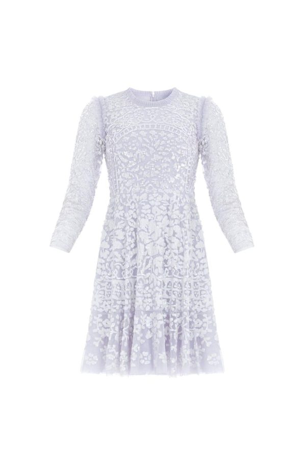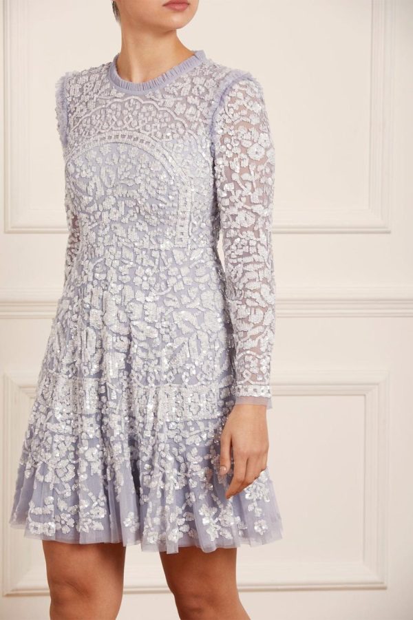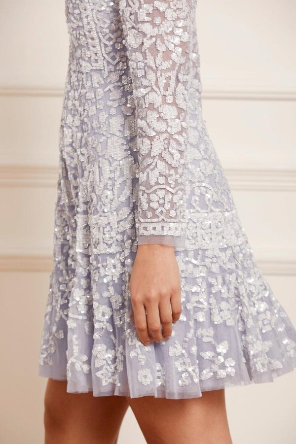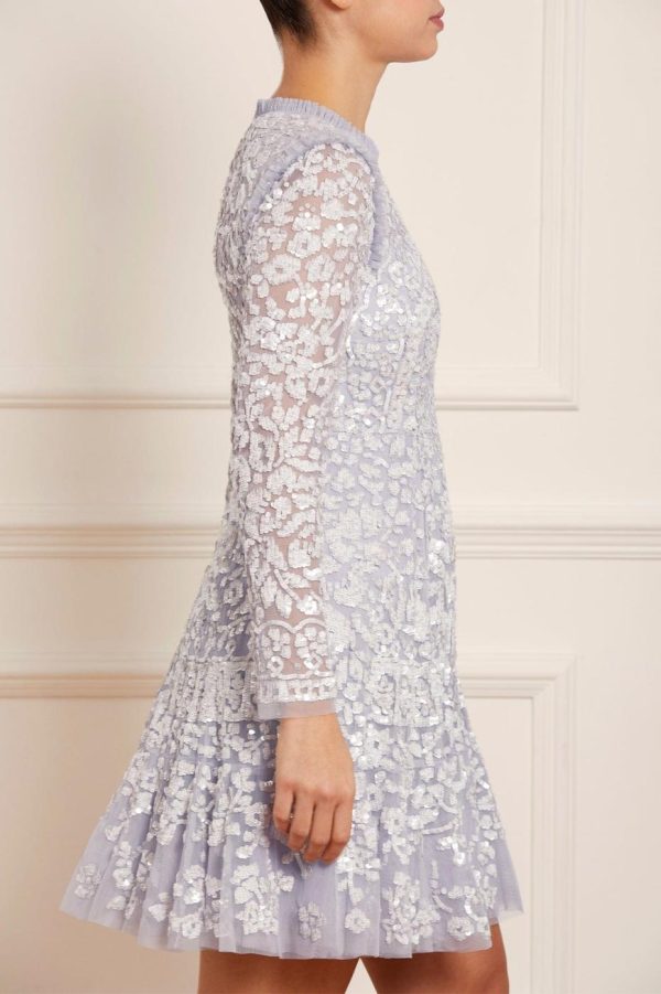 The Amaryllis Mini Dress in Porcelain Blue/White. This embellished mini dress has a fluid floral artwork design with shimmering white sequins. Beautifully crafted with tulle details and a voluminous skirt to create added movement as you walk. Make a statement in the Amaryllis at your next event.