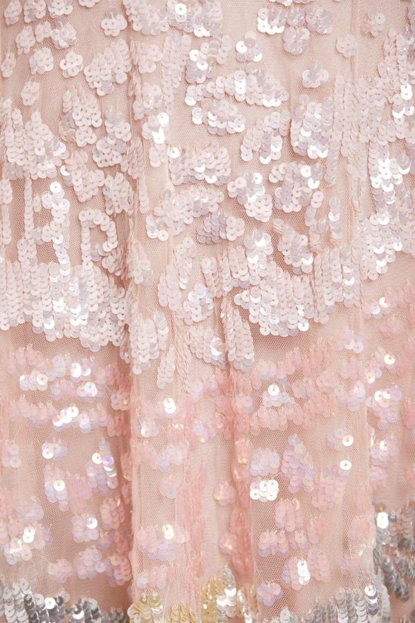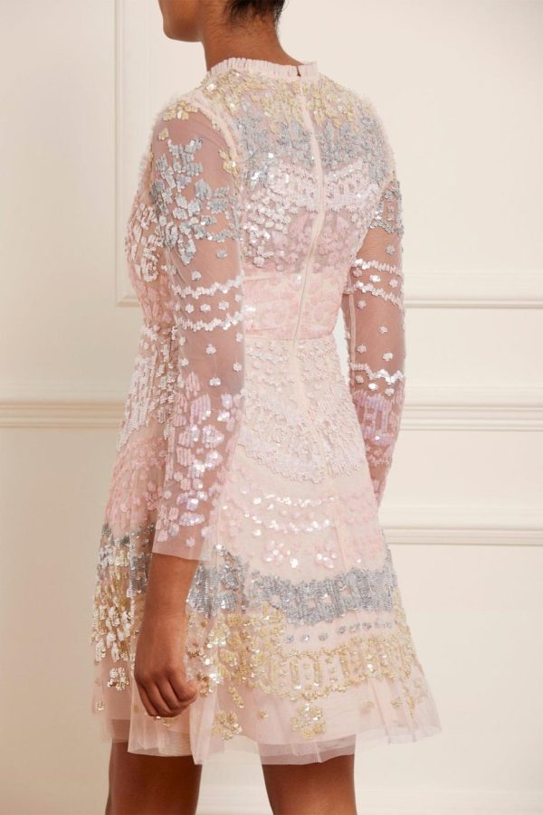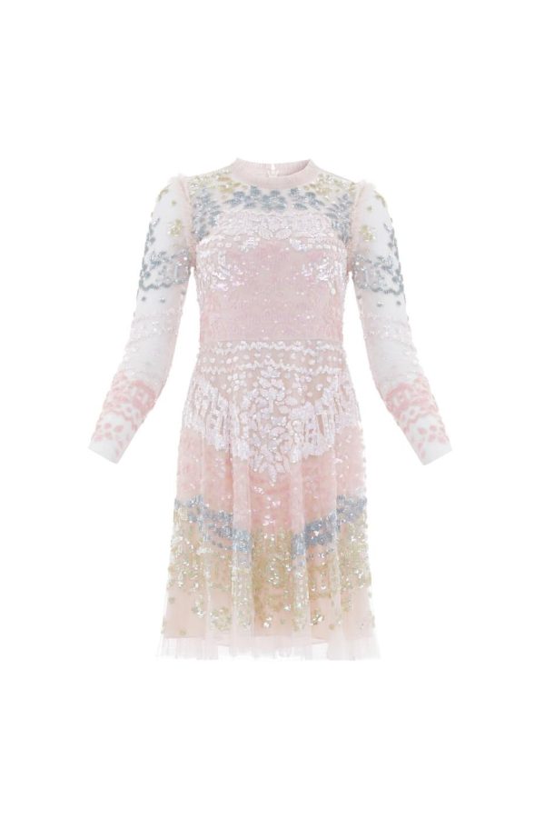 The Angeline Sequin Dress in Pearl Rose / Multi. This eye-catching dress is decorated with muted rainbow shimmering sequins in green, blue and pink. Inspired by a vintage floral lace artwork with horizontal highlights. The Angeline has long sleeves with pretty floral elements, engineered to flatter the A-line silhouette. There is delicate frill lace detailing around the neck and arm for further intrigue. Make an entrance in this showstopping dress.
