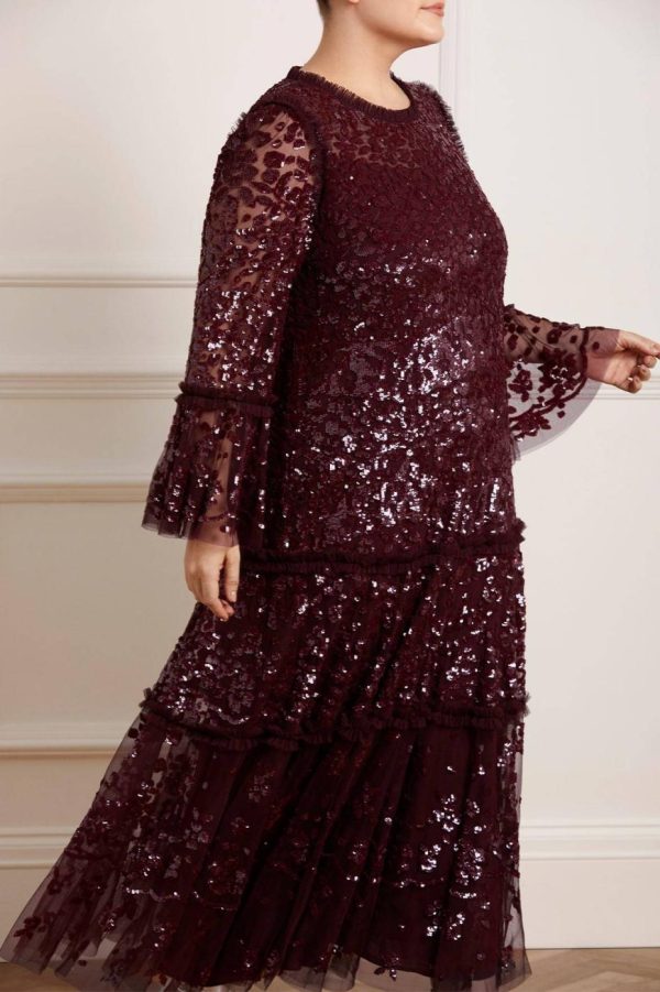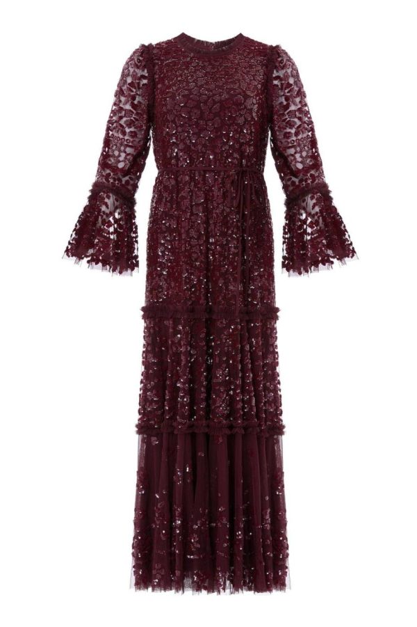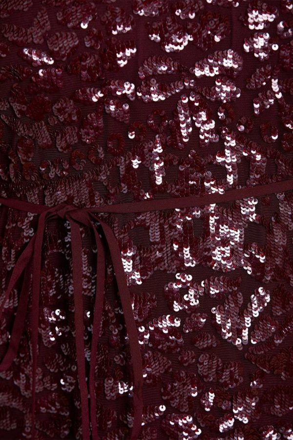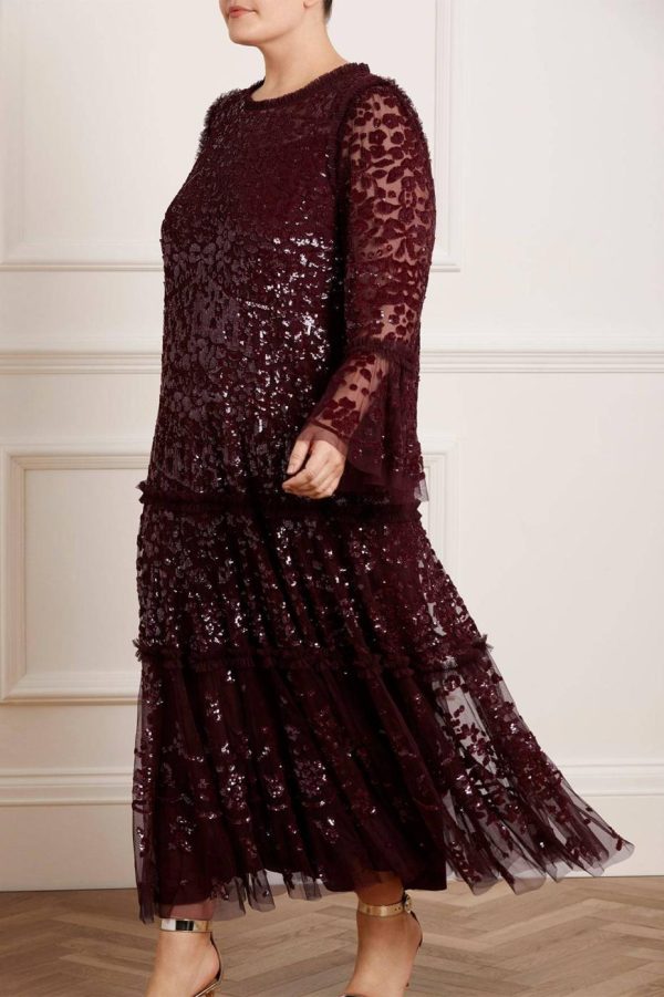 The Annie Sequin Tiered Ankle Gown in Burgundy. Adorned with shimmering sequins in a floral and bow artwork, this gown is inspired by a lace tablecloth. Designed with a loose fit silhouette and tiered throughout, creating beautiful movement. Make an effortless statement.