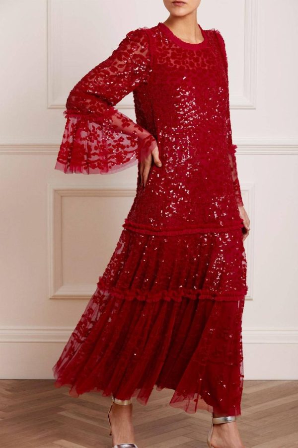 NEEDLE & THREAD EXCLUSIVE. The Annie Sequin Tiered Ankle Gown in Deep Red. Adorned with shimmering sequins in a floral and bow artwork, this gown is inspired by a lace tablecloth. Designed with a loose fit silhouette and tiered throughout, creating beautiful movement. Make an effortless statement.
