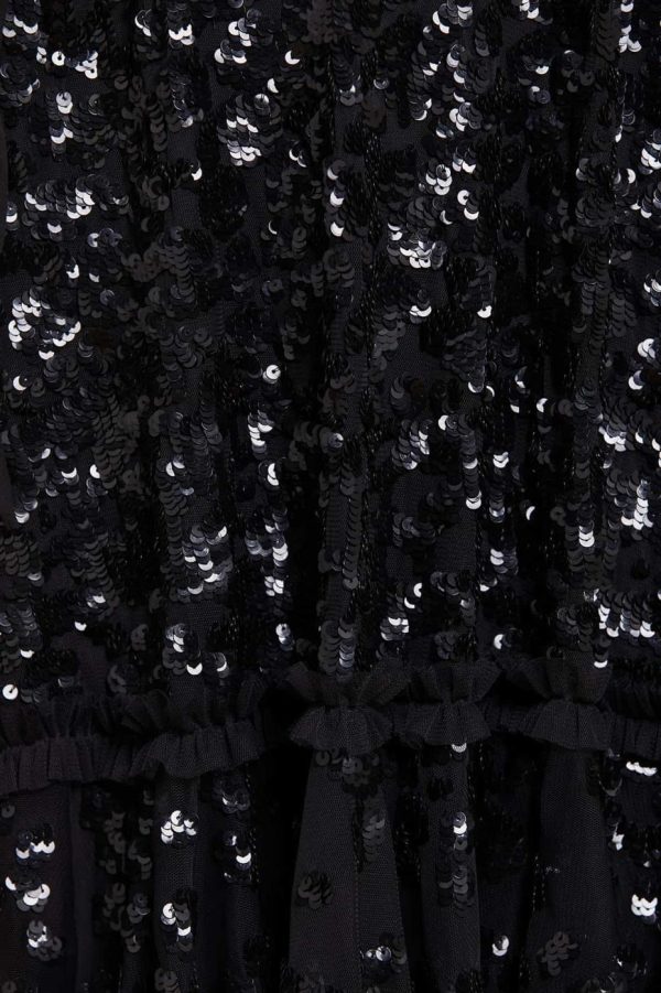 The Annie Sequin Tiered Mini Dress in Graphite. This mini dress is adorned with shimmering sequins in floral and bow artwork inspired by a lace tablecloth. Designed with a loose fit silhouette and tiered throughout, creating beautiful movement. Make an effortless statement in the Annie.