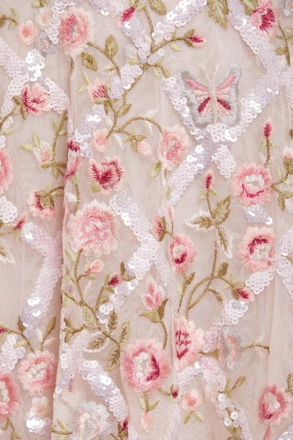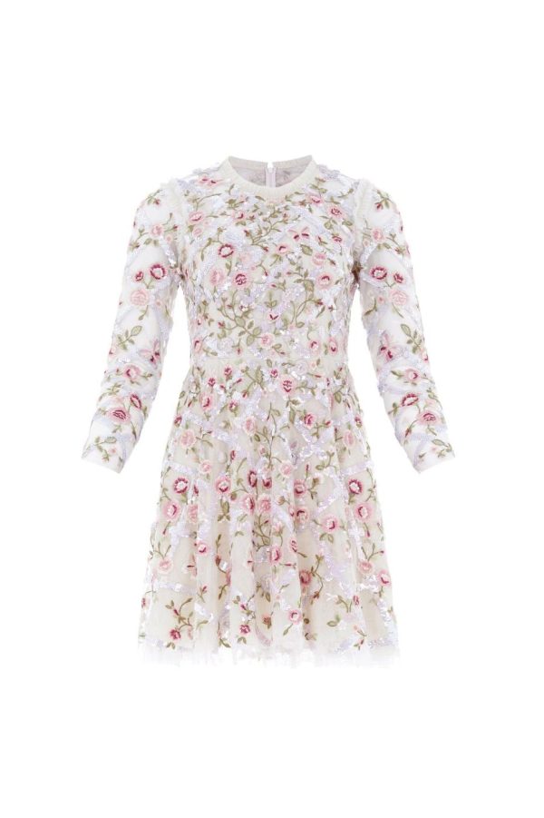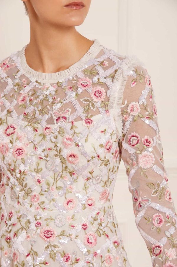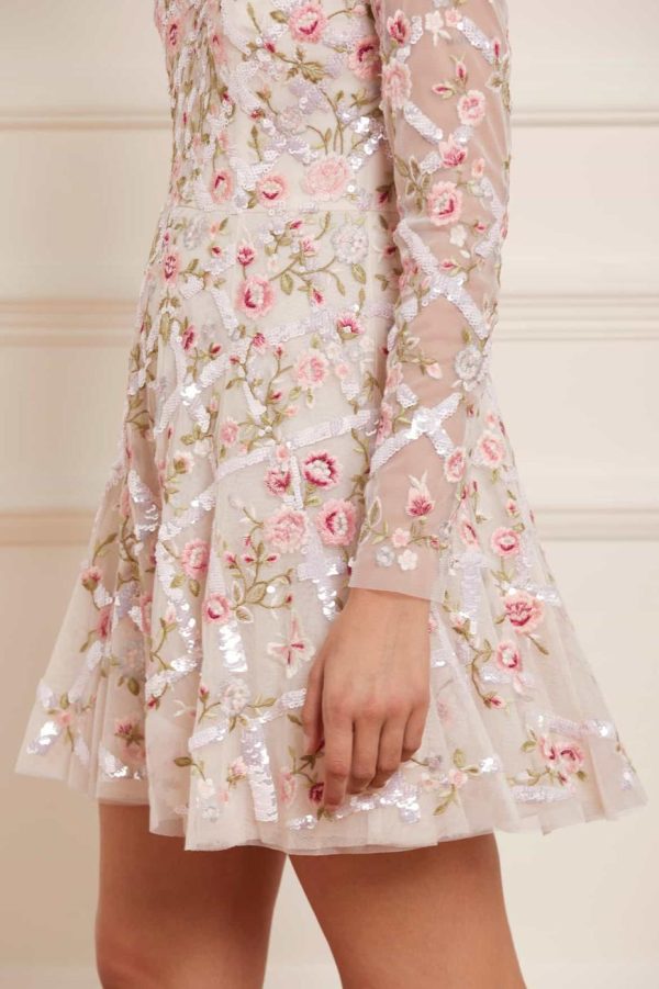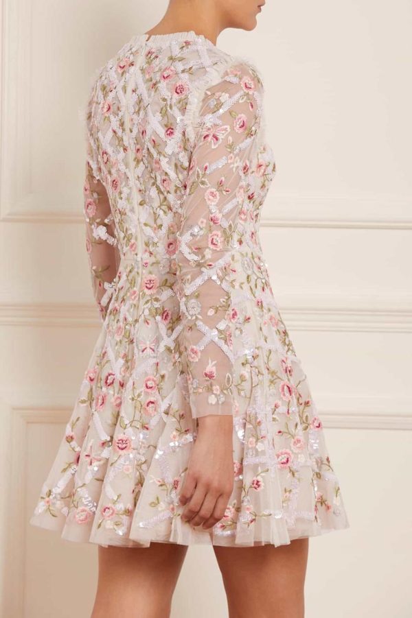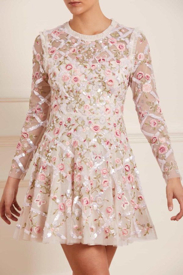 The Athena Rose Micro Mini Dress in Cream. This intricate textile dress is scattered with detailed floral embroidery, inspired by the early 1900’s. Beautifully decorated with shimmering sequins in a diamond formation, adding a shimmer throughout. A timeless wardrobe staple.