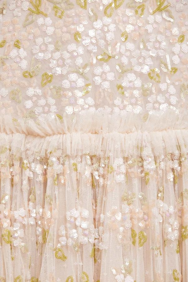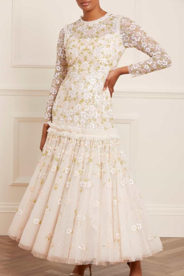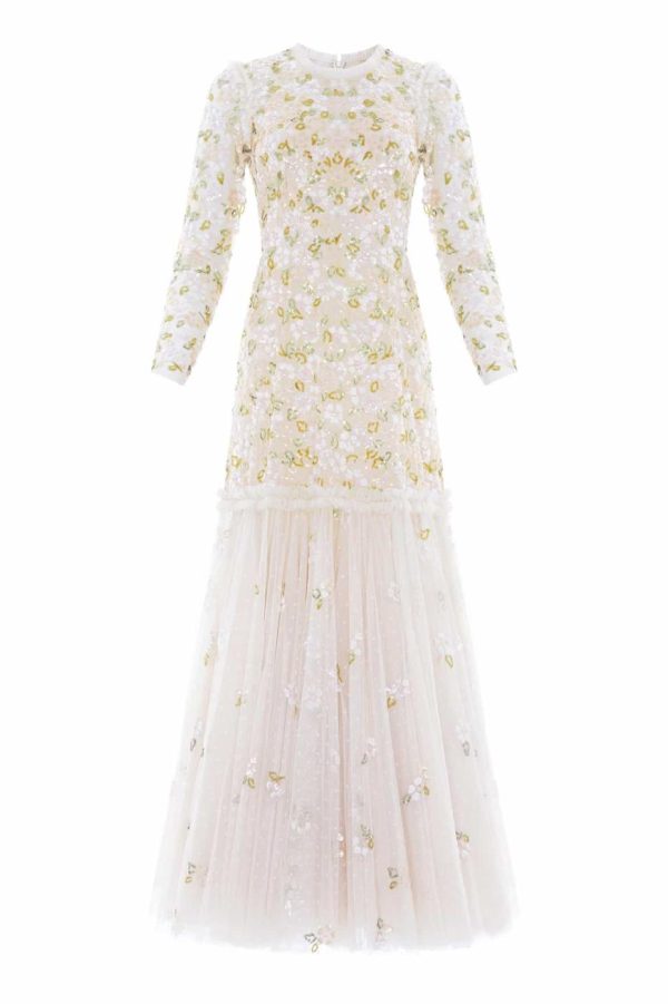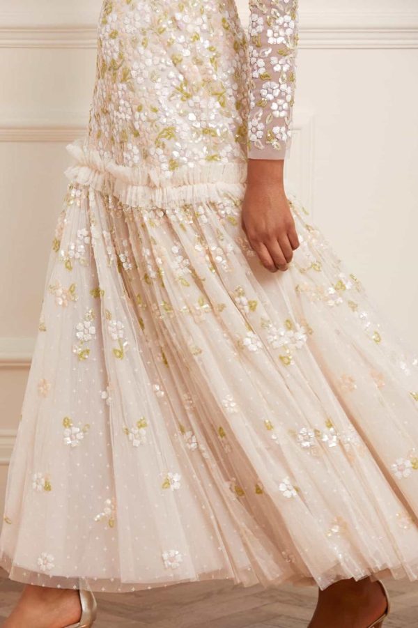 The Brianna Long Sleeve Gown in Cream / Multi. This statement gown is developed with a fitted, flattering bodice, intricately decorated with flower motifs and shimmering sequins for an all-over sparkle effect. The bodice flows into a dramatic, voluminous skirt, crafted from layers of our signature tulle and net, adding romantic frothy texture. Featuring tulle frills throughout for extra Needle & Thread detailing. A gown you’ll forever treasure.