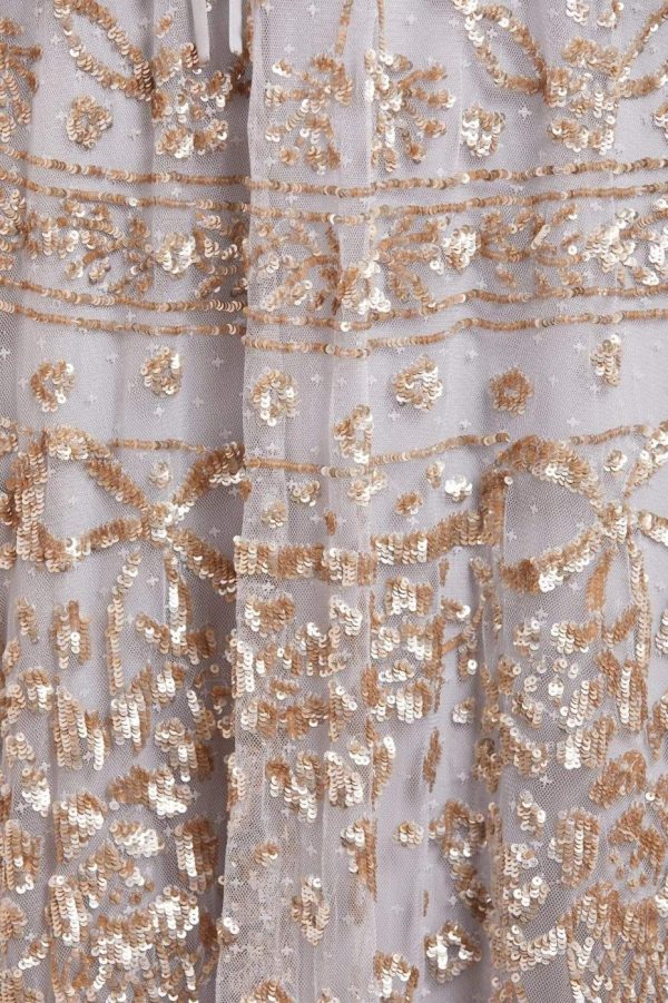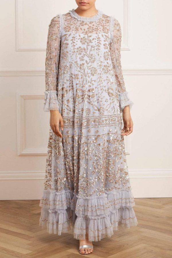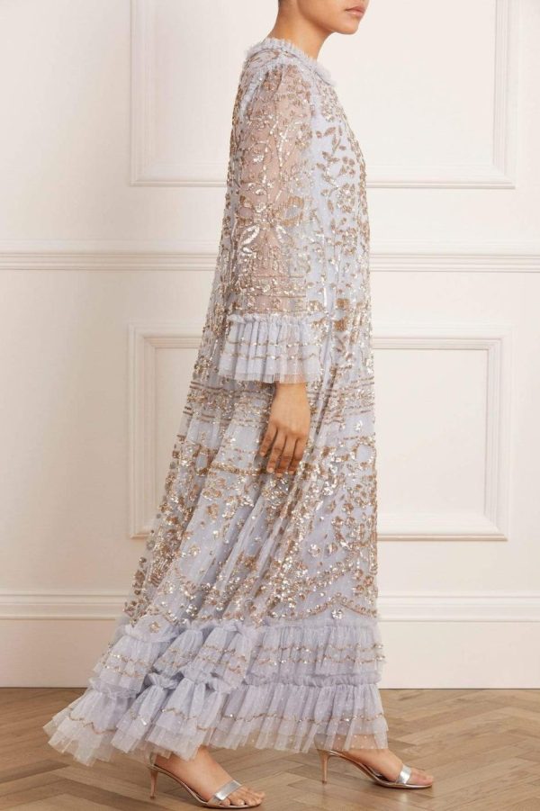 The Celia Long Sleeve Ankle Gown in Blue Mist / Gold. This statement long sleeve gown is designed with romantic artwork featuring ornate florals with ribbon bows, densely filled with shimmering gold sequins and exquisite detailing. Crafted with an effortless, loose fit with soft, playful tulle frills on the hem and cuffs. A key piece of the collection.