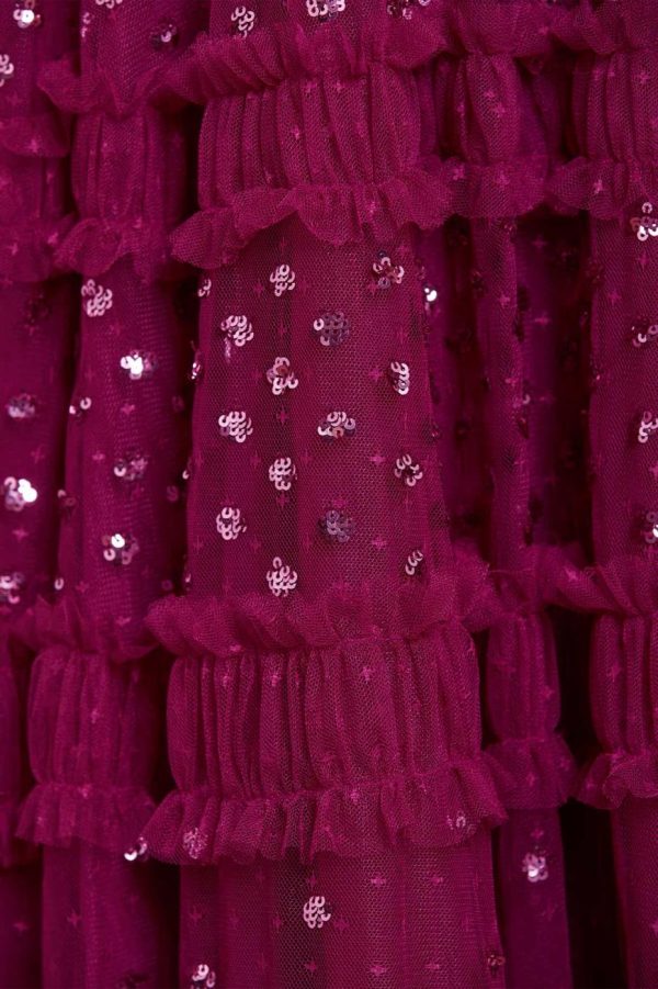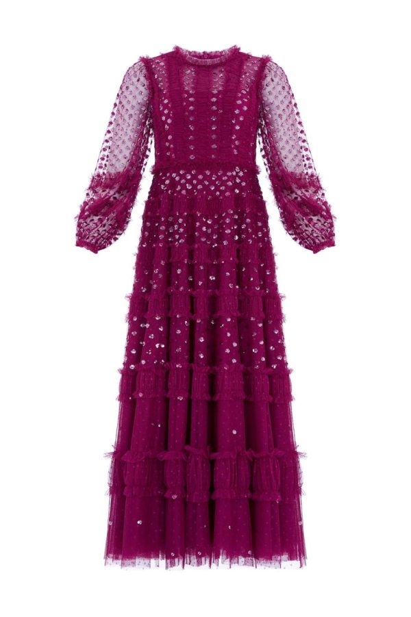 NEW SEASON. The Dot Shimmer Ankle Gown in Plum. Beautifully decorated with gloss sequins creating an extra special shimmering finish. Romantically adorned with stitched ruffles creating texture and movement. Make this piece your new wardrobe favourite.
