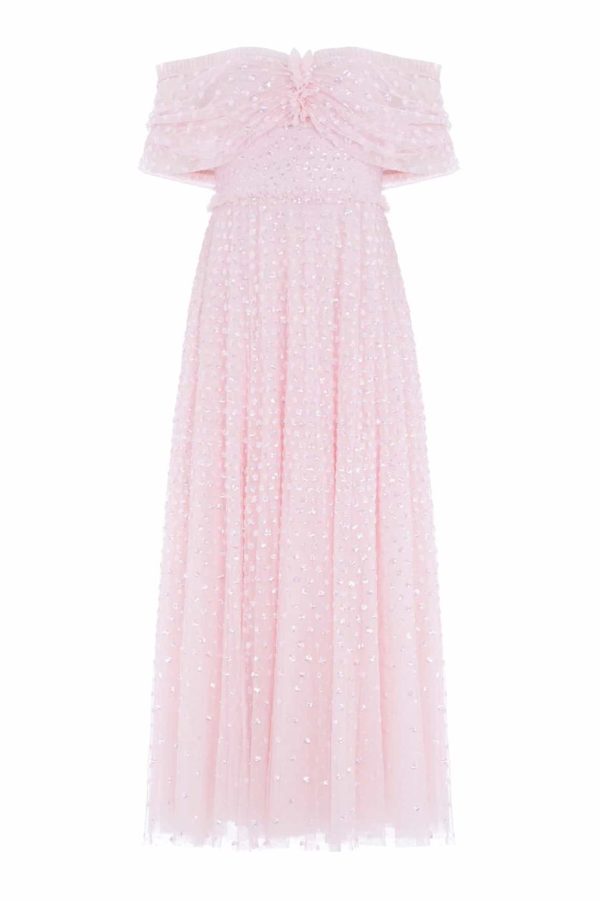 NEW SEASON. The Grace Gloss Off-Shoulder Ankle Gown in Peony Pink. This gown is beautifully decorated with high-shine sequins in dot motifs creating an enchanting, shimmery effect. Crafted with an off-the-shoulder design inspired by iconic Grace Kelly, capturing the elegance of her look perfectly. Designed with an integrated corset for the perfect shape and structure. You’ll forever treasure the Grace Gloss.