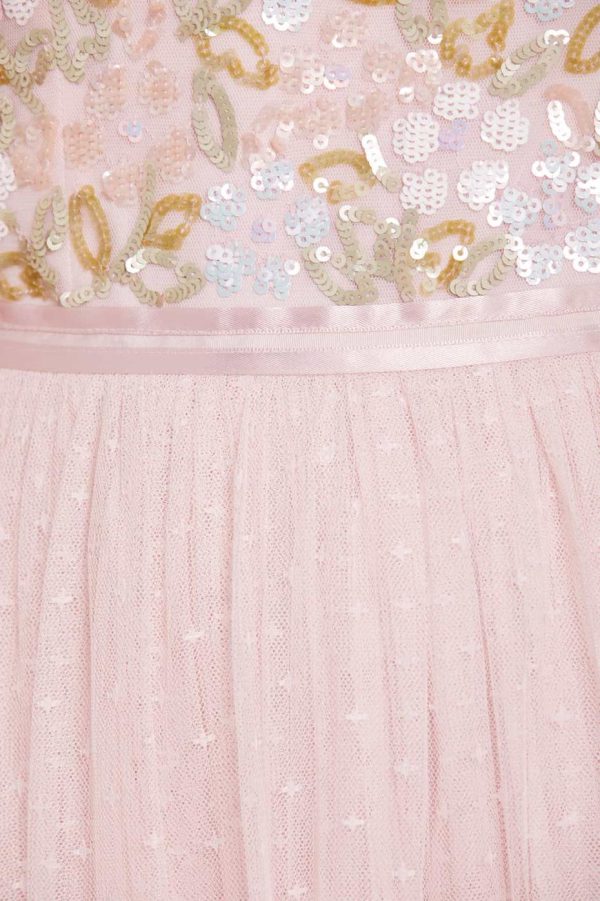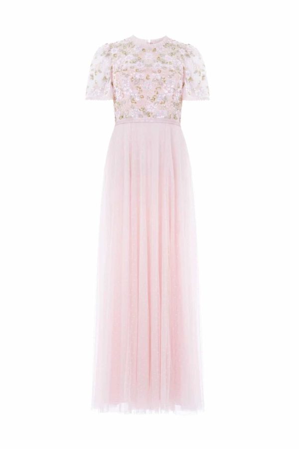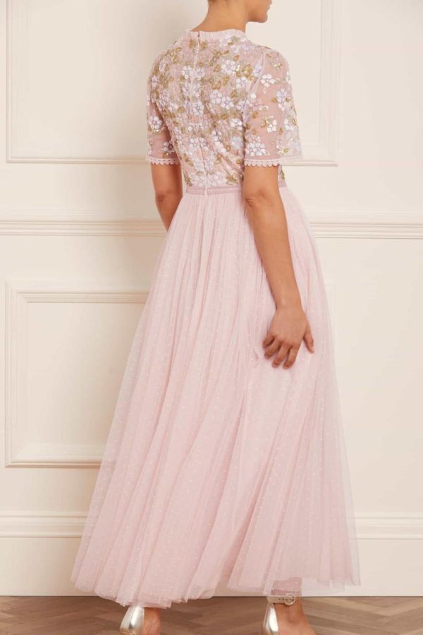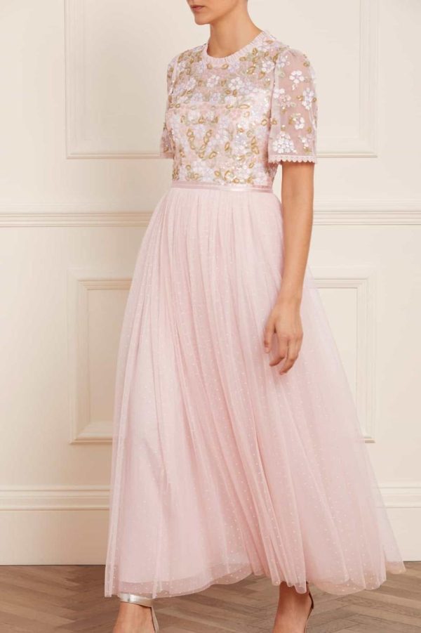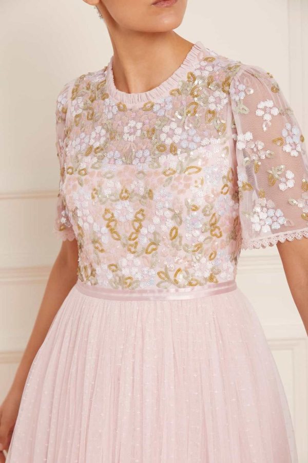The Lena Bodice Ankle Gown in Dusk Pink / Multi. The bodice of this gown is intricately designed with a delicate floral artwork and shimmering sequins for a sparkle effect. The skirt is developed from signature Needle & Thread tulle with ‘x’ motifs for subtle detail. The perfect gown for an upcoming special occasion.