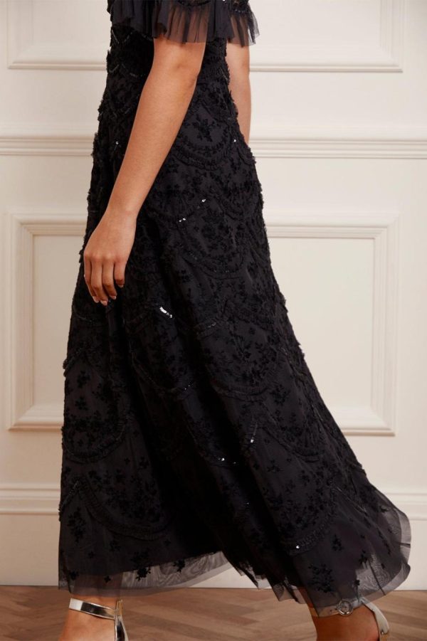 The Lily Bloom Ankle Gown in Graphite. This ankle gown is beautifully designed with delicate tulle ruffles and soft scallop shaping for signature Needle & Thread styling. Adorned with intricate white floral embroidery and trimmed with a high shine sequin adding shimmer throughout. Make the Lily your new wardrobe addition.