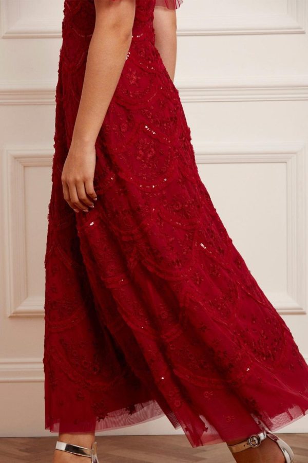 The Lily Bloom Ankle Gown in Deep Red. This ankle gown is beautifully designed with delicate tulle ruffles and soft scallop shaping for signature Needle & Thread styling. Adorned with intricate red floral embroidery and trimmed with a high shine sequin adding shimmer throughout. Make the Lily your new wardrobe addition.