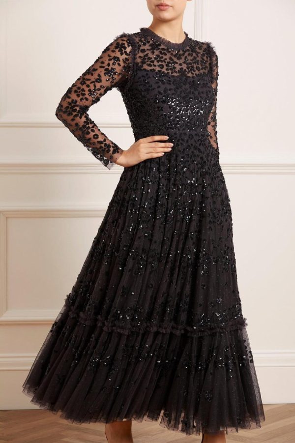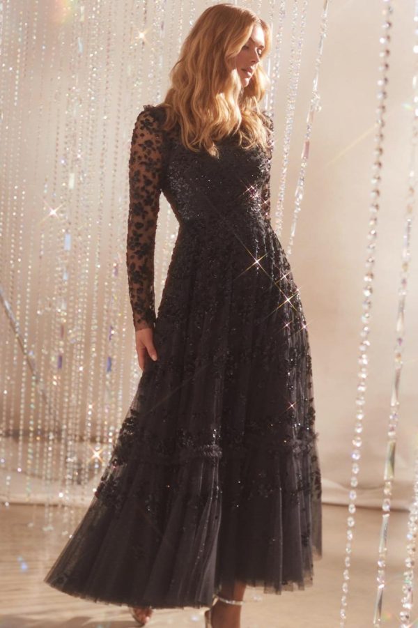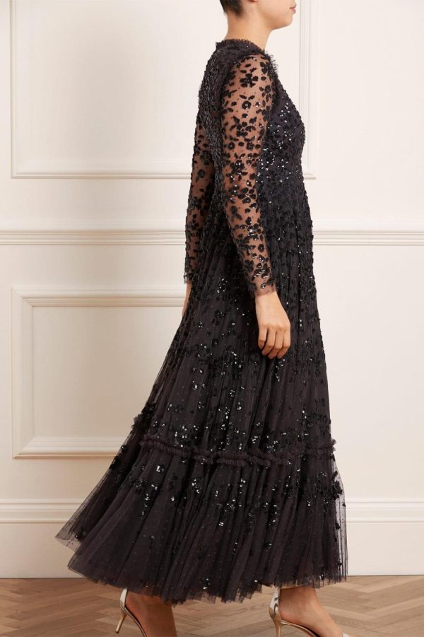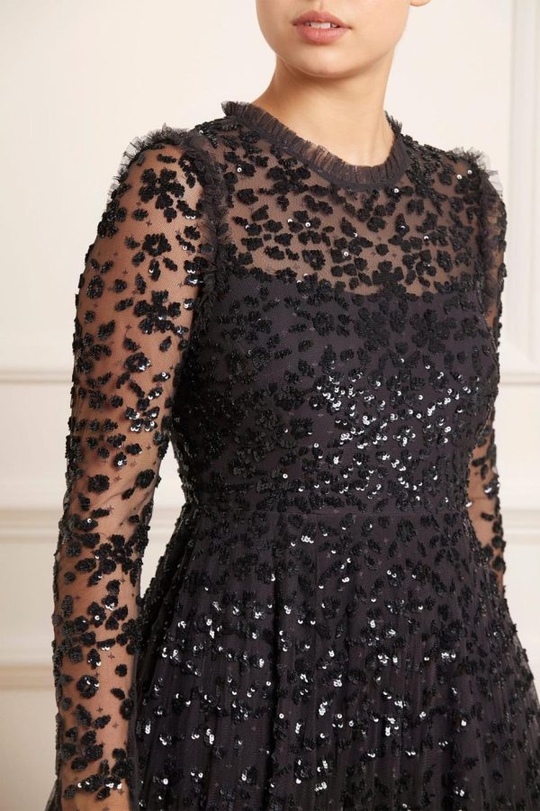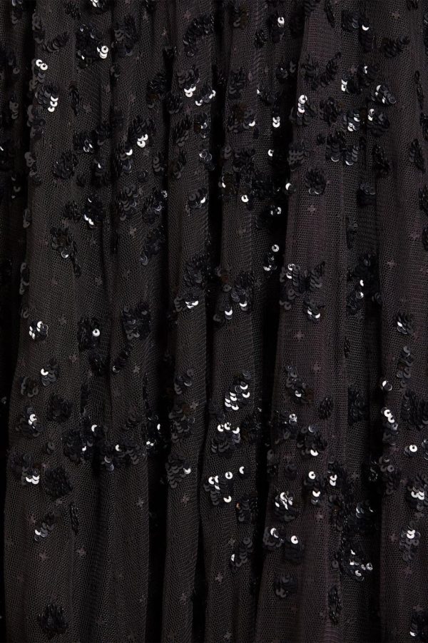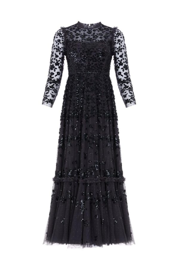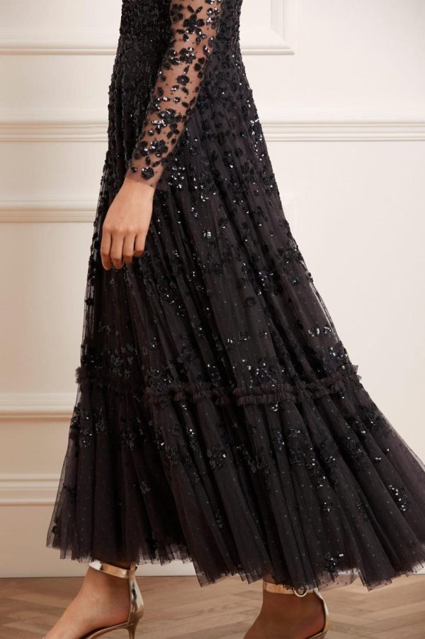 NEEDLE & THREAD EXCLUSIVE. The Margot Ankle Gown in Graphite. This statement piece is adorned with a floral, sequin artwork creating an all over shimmer effect. Crafted with a dramatic, sweeping hemline to create romantic movement. Make a statement in this show-stopping piece.