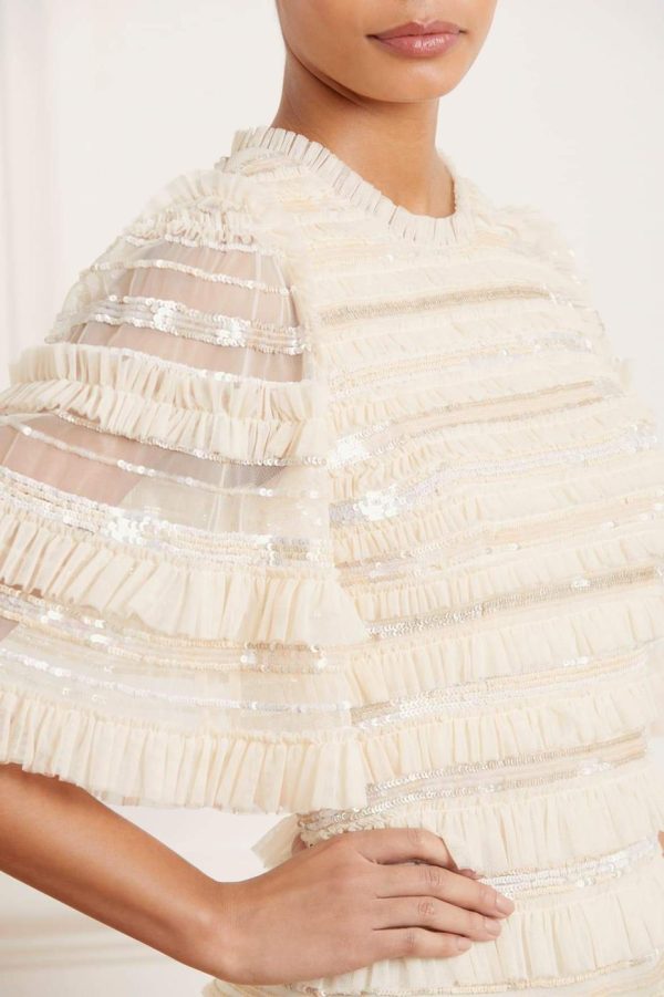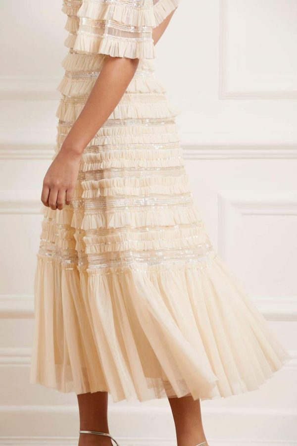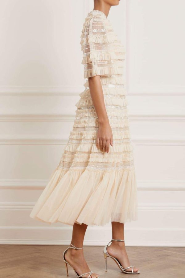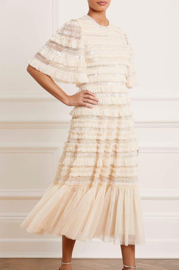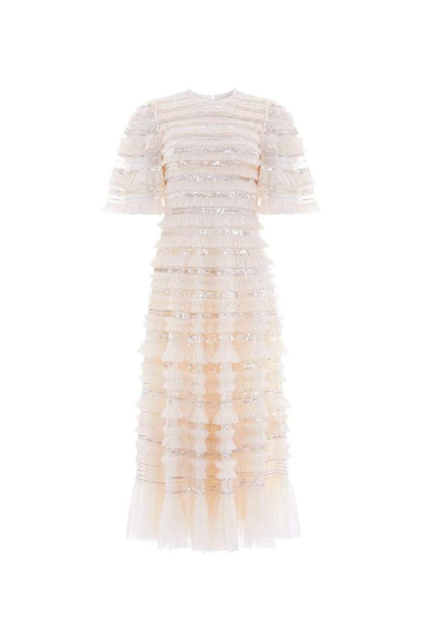 The Nancy Frill Ballerina Dress in Champagne. This romantic dress is designed with delicate layers of gathered tulle featuring ruffle trims. Beautifully scattered with shimmering sequins in subtle, contrasted tones. Designed with an elegant silhouette and flattering mid-length sleeves. Make the Nancy your next go-to dress.