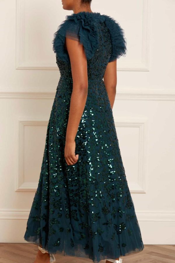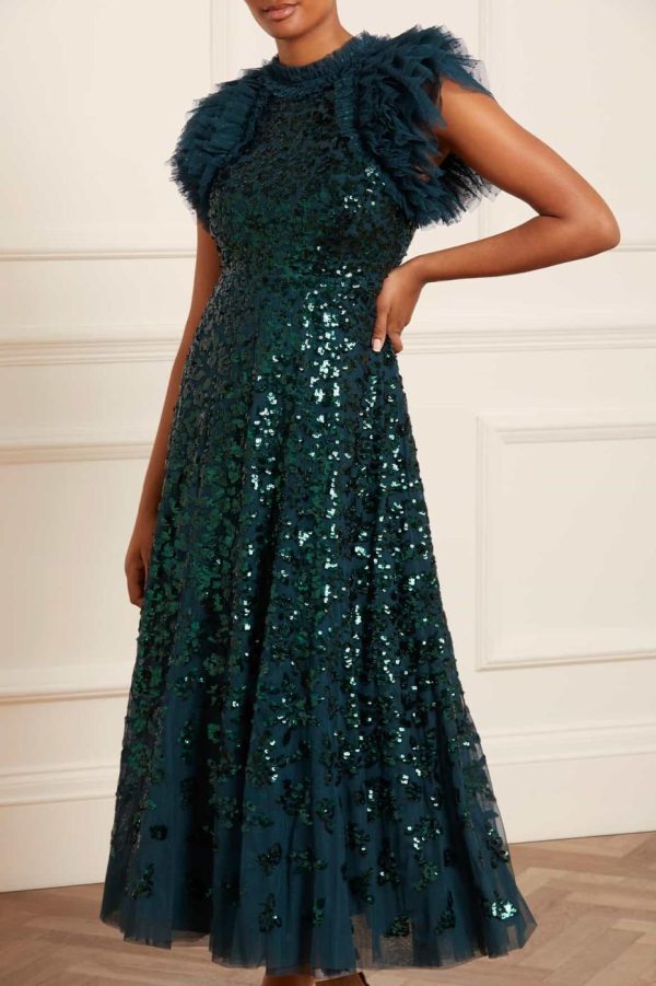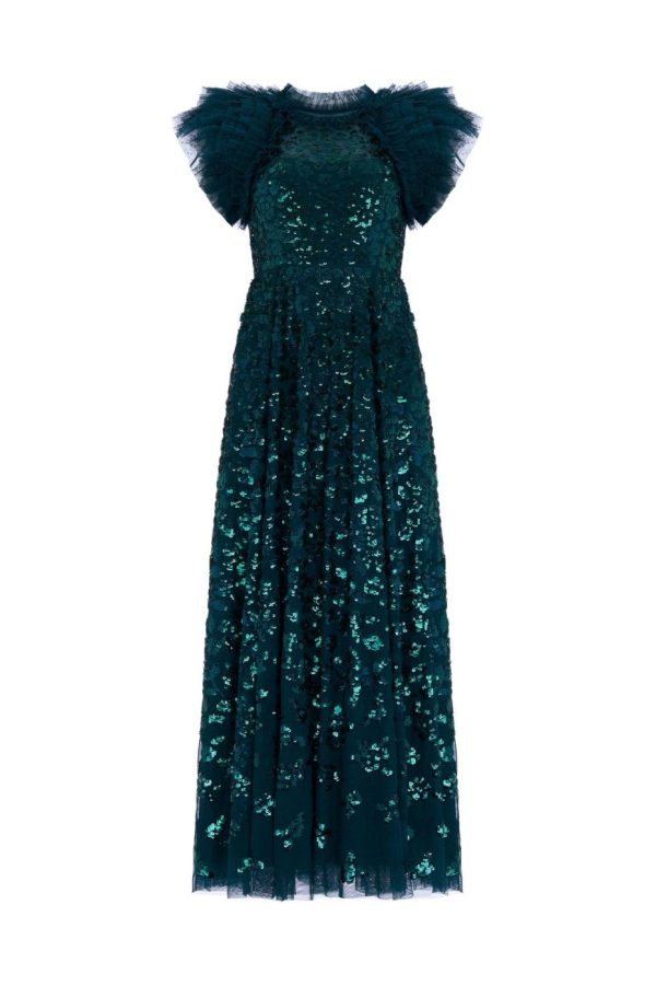 NEW SEASON. The Sequin Rose Ankle Gown in Emerald. A brand new style for the season ahead. Engineered with statement Needle & Thread detail, featuring signature sleeves from our favourite Genevieve style. Crafted with layers of delicate tulle and net to create a dramatic, voluminous silhouette. This gown is decorated with shimmering sequins featuring intricate rose motifs. Our Needle & Thread team adore this new style.