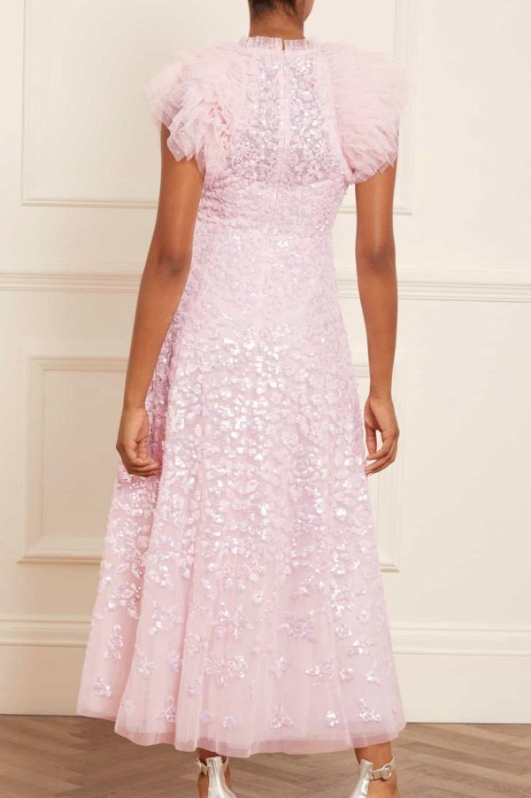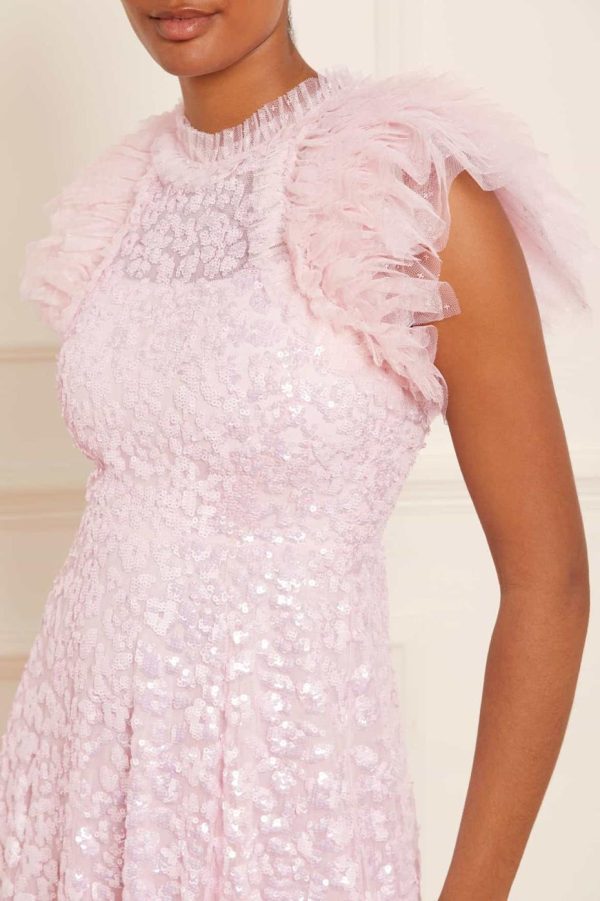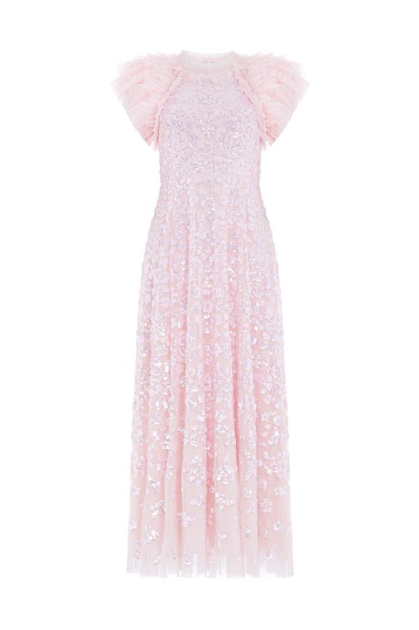 NEW SEASON. The Sequin Rose Gloss Ankle Gown in Peony Pink. A brand new style for the season ahead. Engineered with statement Needle & Thread detail, featuring signature sleeves from our favourite Genevieve style. Crafted with layers of delicate tulle and net to create a dramatic, voluminous silhouette. This gown is decorated with gloss sequins for a high-shine look and intricate rose motifs. Our Needle & Thread team adore this new style.