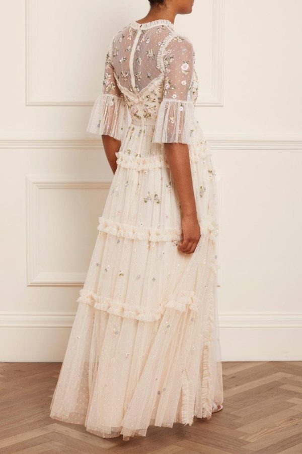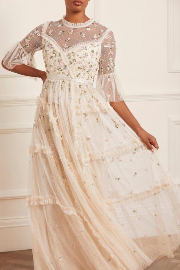 NEEDLE & THREAD EXCLUSIVE | The Shimmer Ditsy Long Sleeve Gown in Champagne. Beautifully decorated with floral multi-coloured cluster motifs, depicted in soft white, pink and bronze tones. Crafted with kisses tulle, adorned with deconstructed seams and intricate ruffle trims, creating a romantic, contemporary silhouette. Designed with long, sheer sleeves and our signature grosgrain ribbon at the waist. Shimmer under the spotlight in your new wardrobe staple.